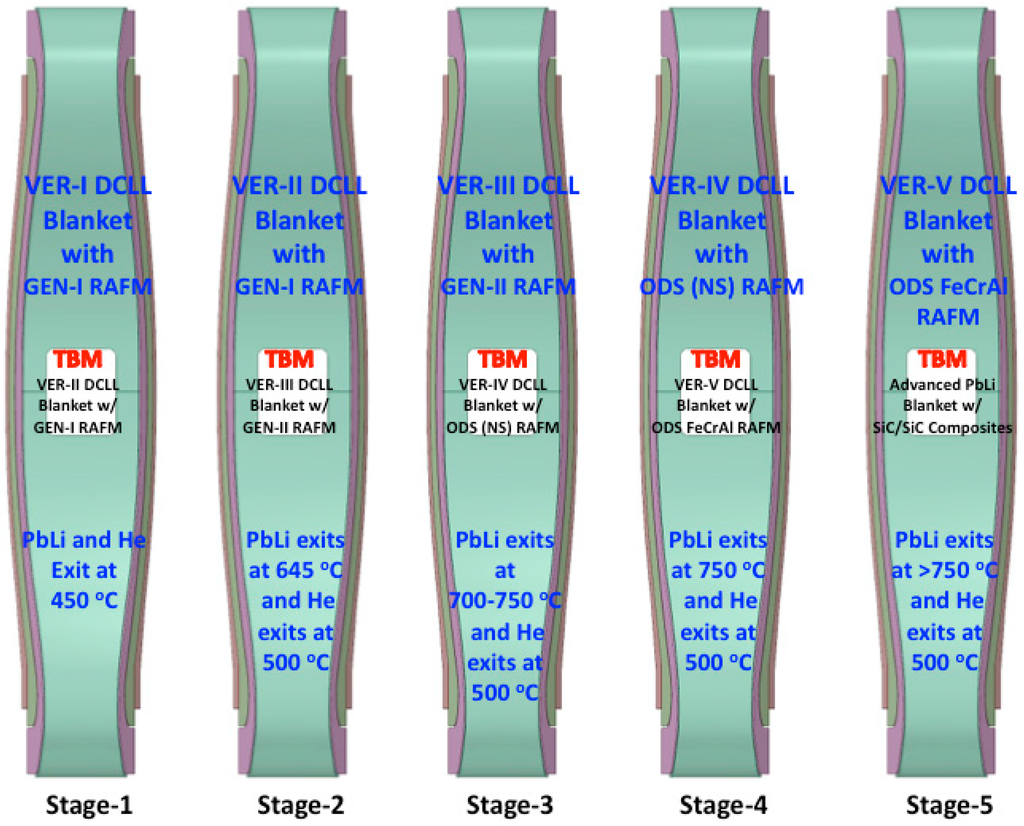 - In Stage-4, VER-IV DCLL blanket first tested successfully in the TBM of Stage-3 and then installed in all sectors of Stage-4: DCLL blanket with ODS (NS) structure operating at 700 °C, PbLi exit temperature of 750 °C, He exit temperature of 500 °C, and maximum interface steel/PbLi temperature > 500 °C.