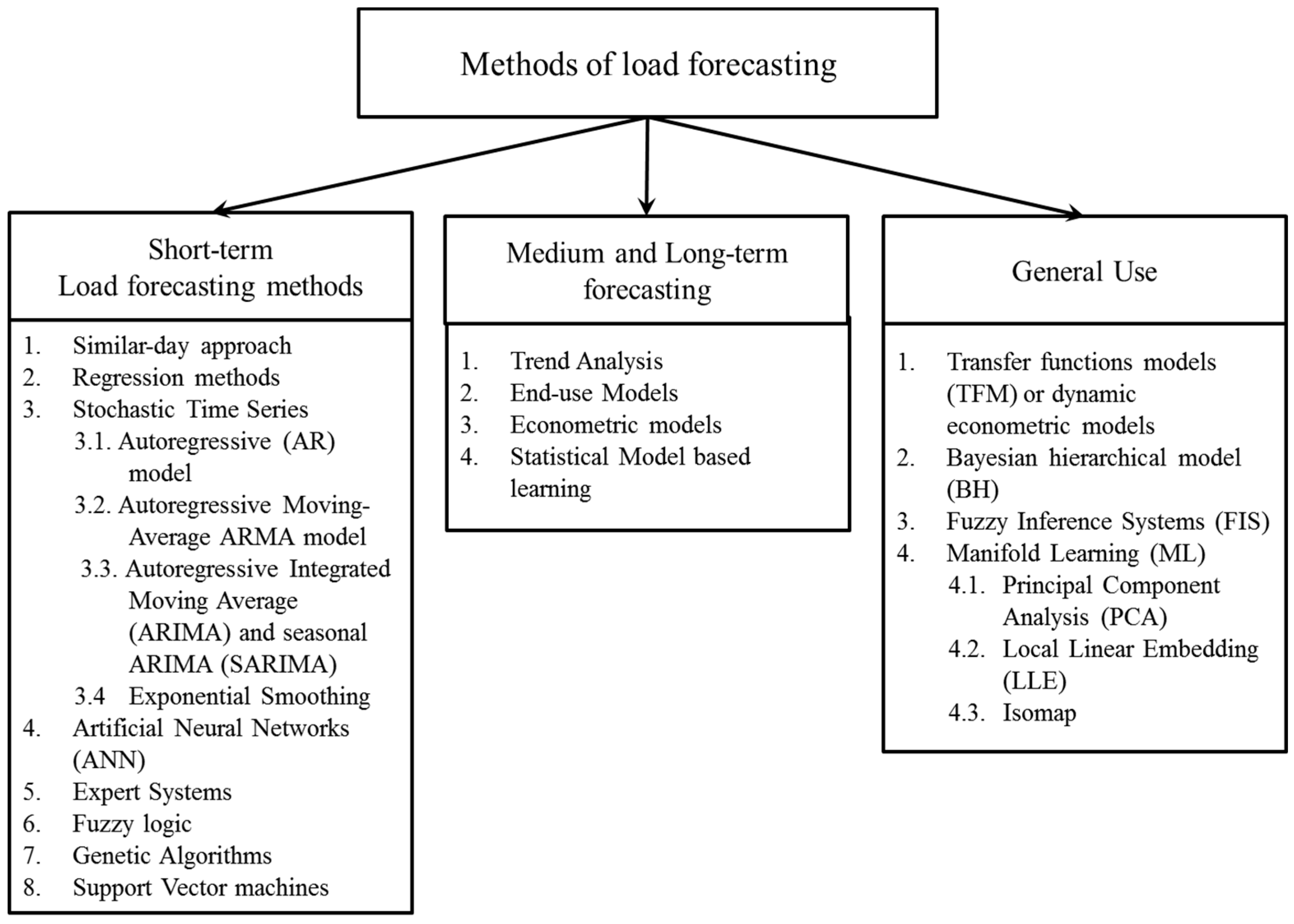 Available methods applied in each case of load forecasting, based on forecasting horizon (short-term, medium-term, or long-term).