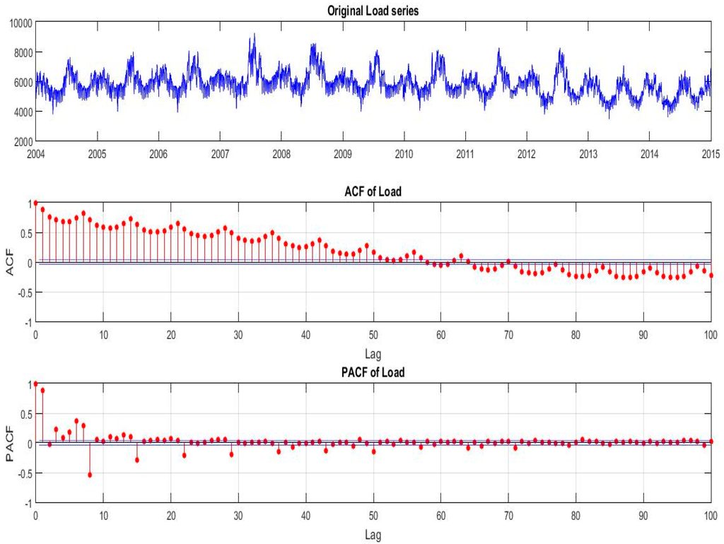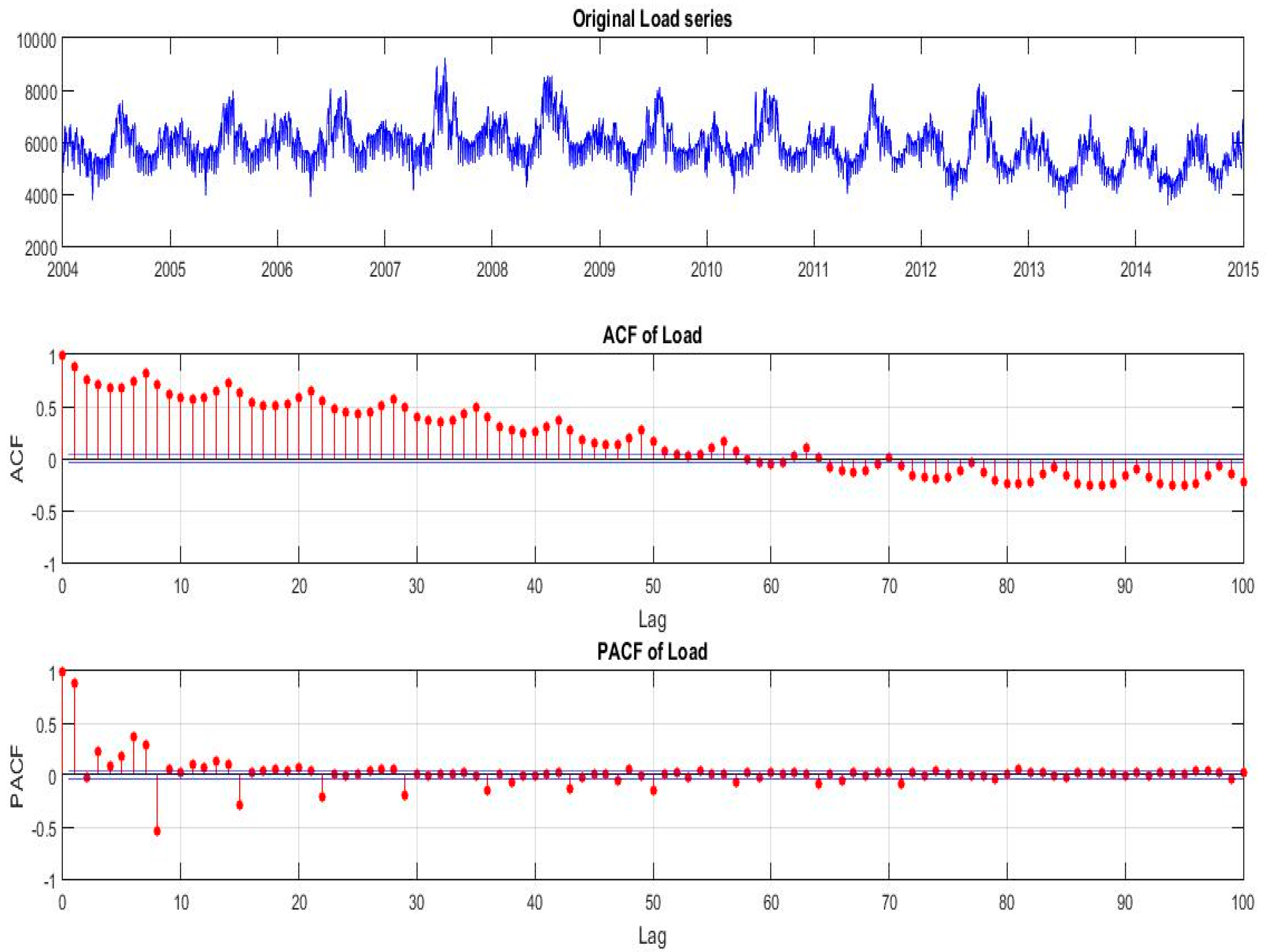 Daily average (of 24 h) load in Greek electricity market, 2004–2014, with its autocorrelation and partial autocorrelation functions.