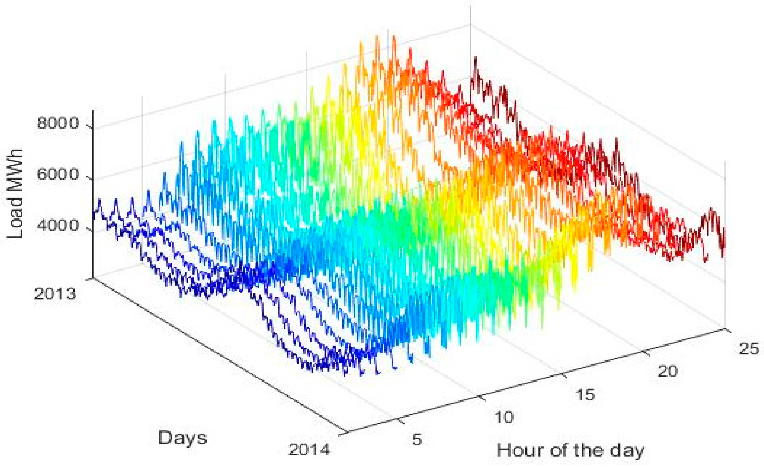 Figure 3 depicts the evolution of load for each hour of the day for the year 2013, while in Figure 4 we show the fluctuation of the mean, variance, kyrtosis and skewness of load for each hour of the day and for the period 2004–2014.