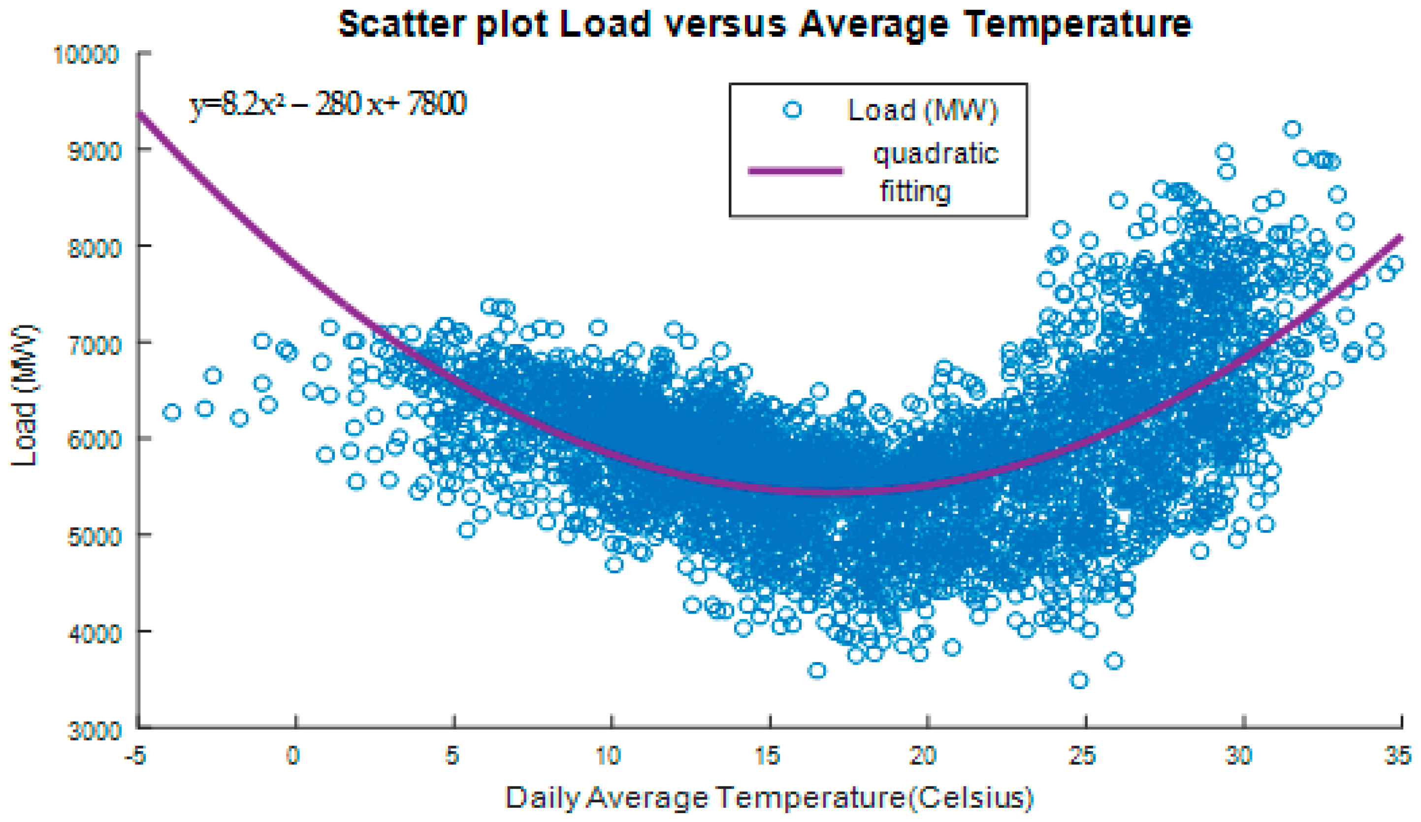 The graph shows a parabolic shape indicating increased consumption at high and low temperatures [33]. It suggests also that forecasting future load (demand), requires the knowledge of load growth profile, relative to a certain reference i.e., the current year. The polynomial function of load versus temperature shown on the graph seems a reasonable approximation for load forecasting. Due to quadratic and strong correlation between temperature and load, we have included temperature as an exogenous—explanatory variable in the modeling in order to enhance model’s predictive power. More specifically, we have considered the temperature deviation from comfortable living conditions temperature in Athens, for the current and previous day respectively (Tsekouras [104]):