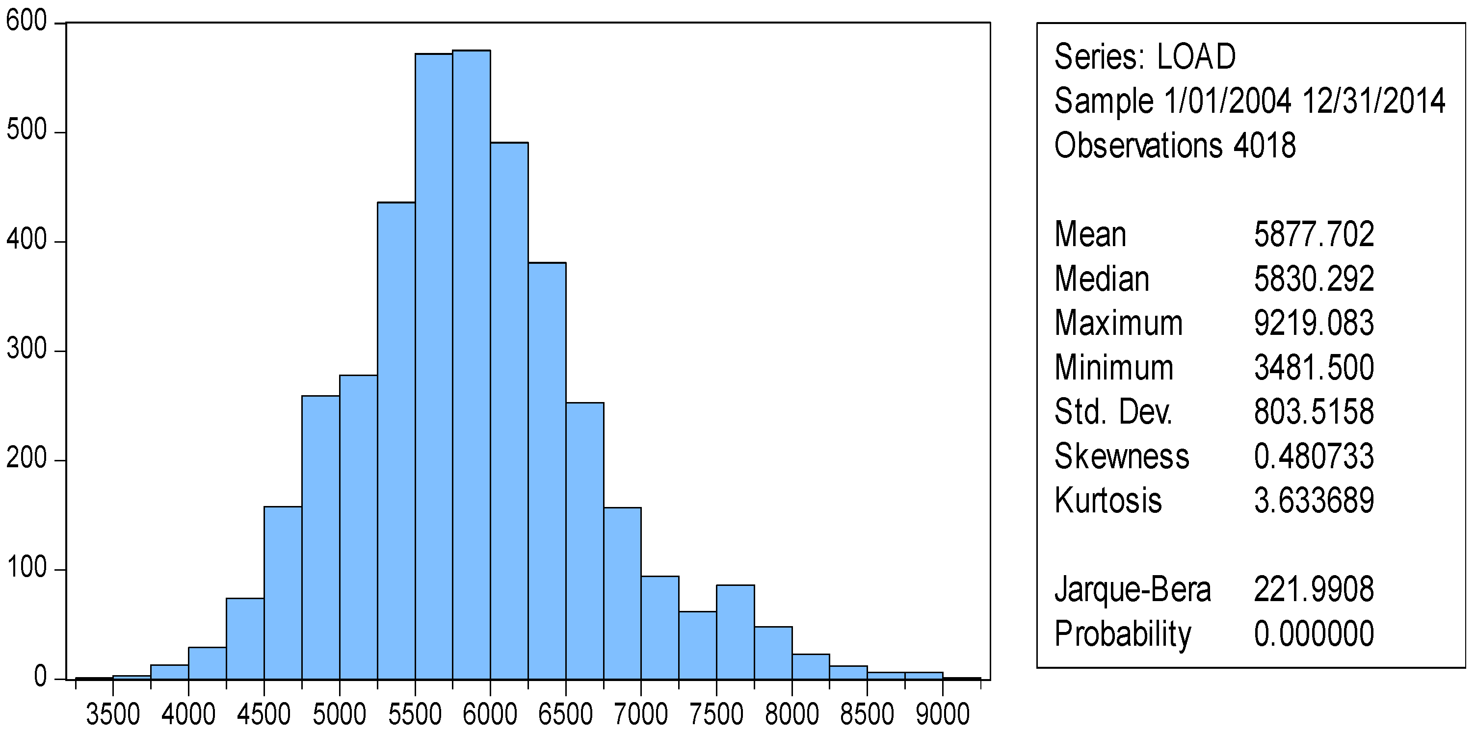 Before proceeding to formulate a model, we apply various statistical tests in order to examine some core properties of our data, namely stationarity, normality, serial correlation, etc. The Jarque and Bera (JB) algorithm [105] assumes the null hypothesis that the sample load series has a normal distribution. The test as we see rejected the null hypothesis at the 1% significance level, as it is shown in the analysis (p = 0.000, JB Stat significant). From the descriptive statistics of the above figure the positive skewness and kurtosis indicate that load distribution has an asymmetric distribution with a longer tail on the right side, fat right tail. Thus load distribution is clearly non-normally distributed as it is indicated by its skewness (different but still close to zero), and excess kurtosis (>3) since normal distribution has kurtosis almost equal to three (3). That means that our data need to be transformed in such way in order to have a distribution as close to normal as possible.
