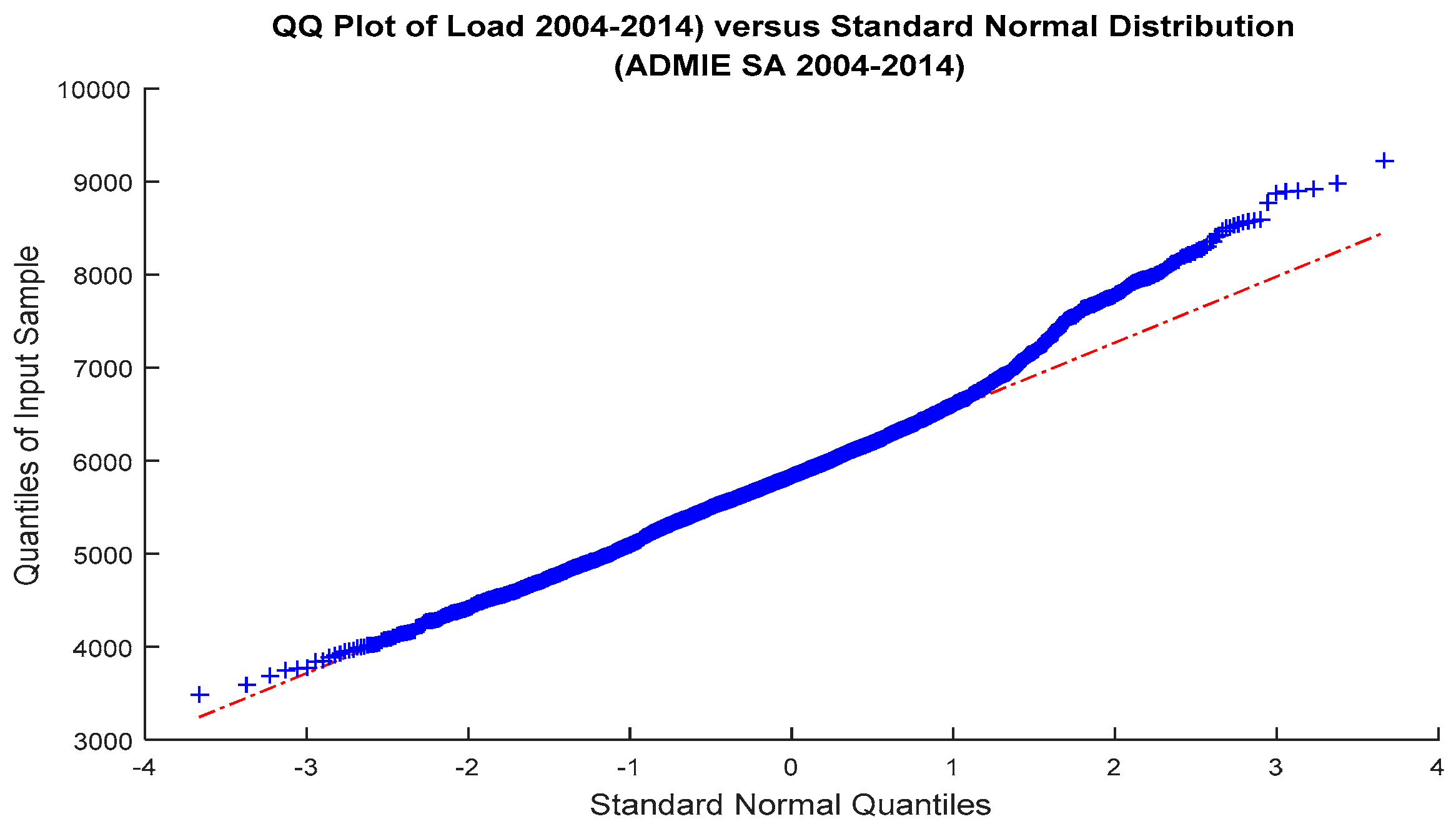 The Q-Q plot of load series, indicating a deviation from normality at right tail.