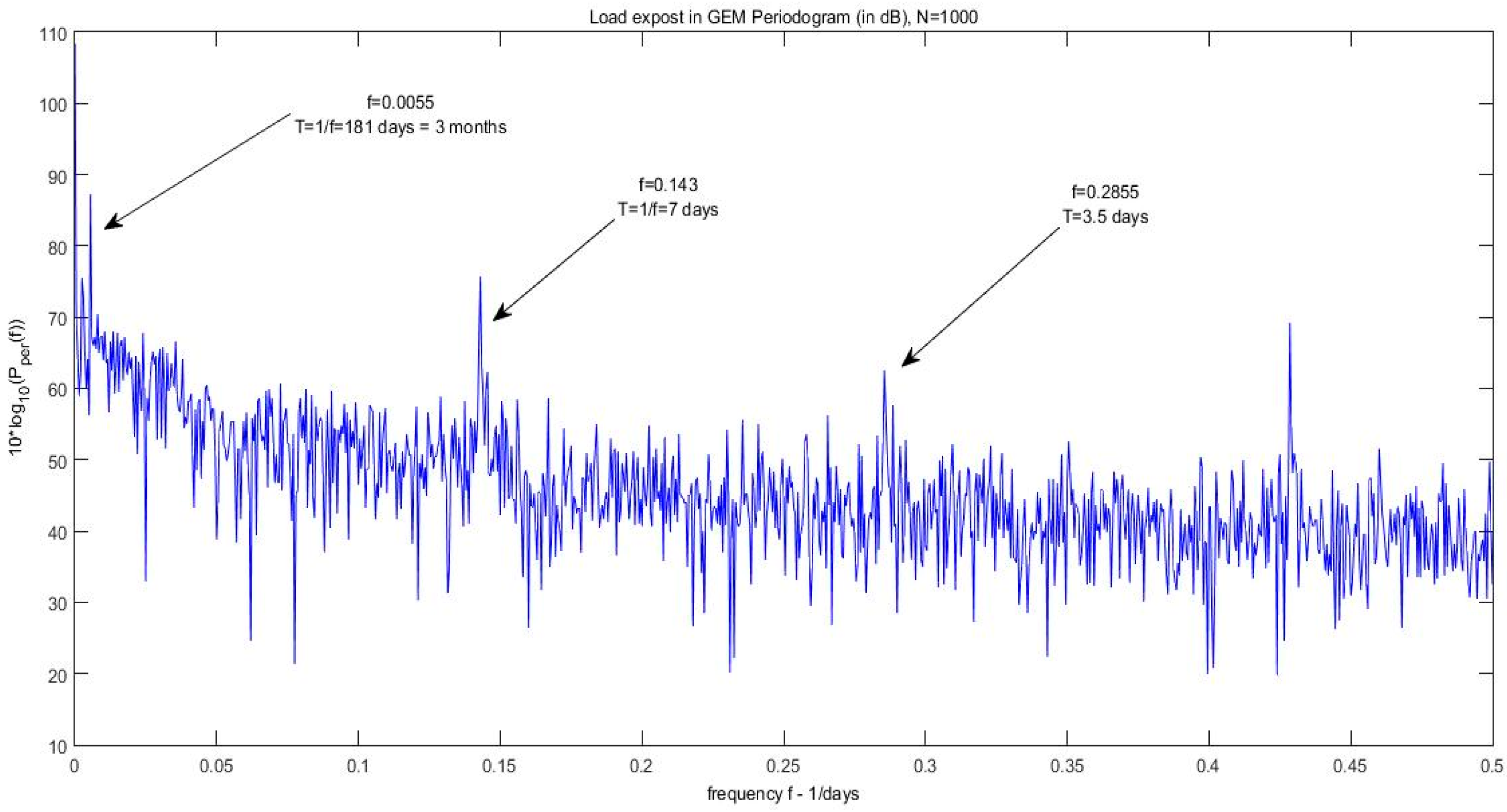 In this section we also identify the cyclical patterns of load for the period 2004 to 2014. This can be done by decomposing our signals which contain cyclical components in its sinusoidal functions, expressed in terms of frequency i.e., cycles per unit time, symbolized by ω. The period, as we know, is the reciprocal of ω i.e., T = 1/ω. Since our signal is expressed in daily terms, a weekly cycle is obviously 1/0.4128 = 7 days or 1/52.14 = 0.0192 years expressed annually. A typical tool for revealing the harmonics or spectral components is the periodogram. Let our set of signal measurements or the load time series is {xi, i = 1,…n}, then the periodogram is given as follows: