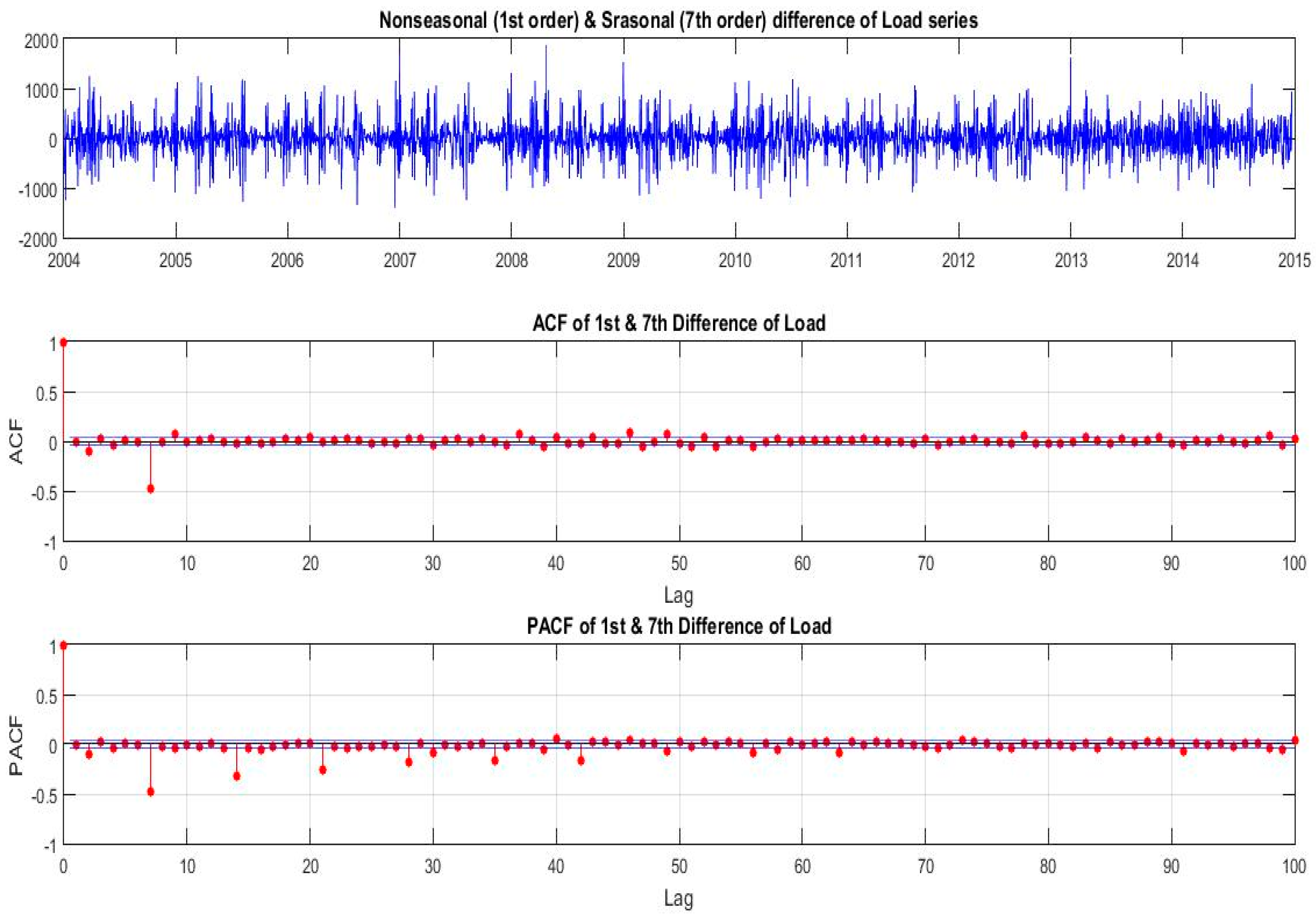 i.e., the nonseasonal first difference times the seasonal (of period 7 days) difference times Load, where , the lag operator. In Figure 9 we show the ACF and PACF of the transformed series.