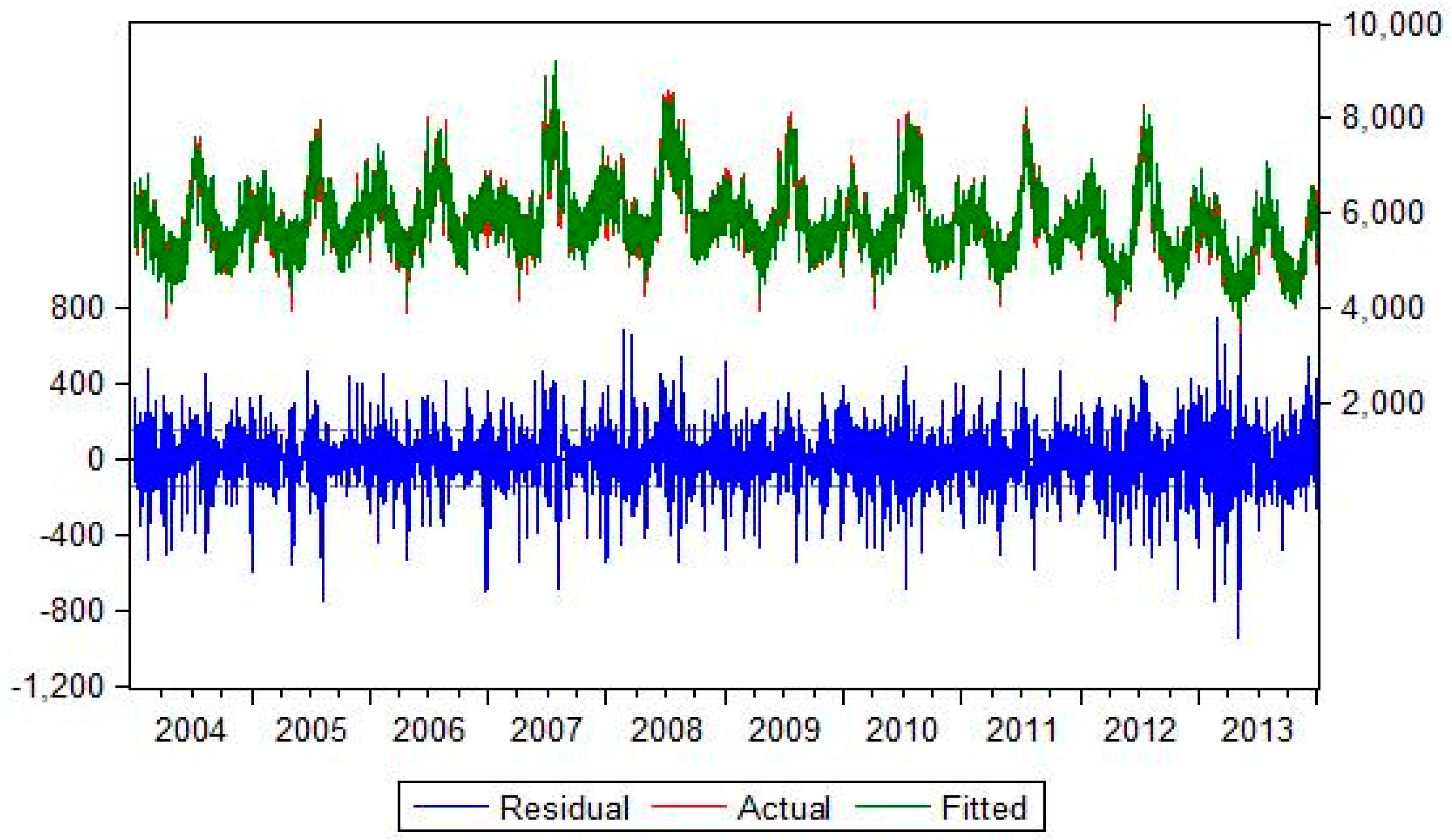 - Ljung, G.M.; Box, G.E.P. On a Measure of Lack of Fit in Time Series Models. Biometrica 1978, 66, 67–72. [Google Scholar] [CrossRef]