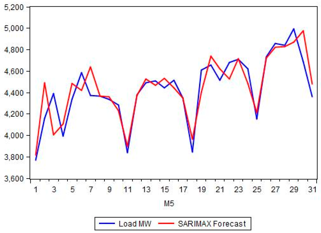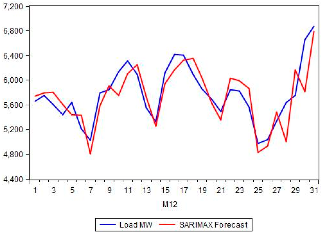The seasonal (or multiplicative) ARIMA model (SARIMA) is an extension of the Autoregressive Integrated Moving Average (ARIMA) [8,9] model, when the series contains both seasonal and non-seasonal behavior, as our time series load does. This behavior of load makes the typical ARIMA model inefficient to be used. This is because it may not be able to capture the behavior along the seasonal part of the load series and therefore mislead to a wrong selection for non-seasonal component.