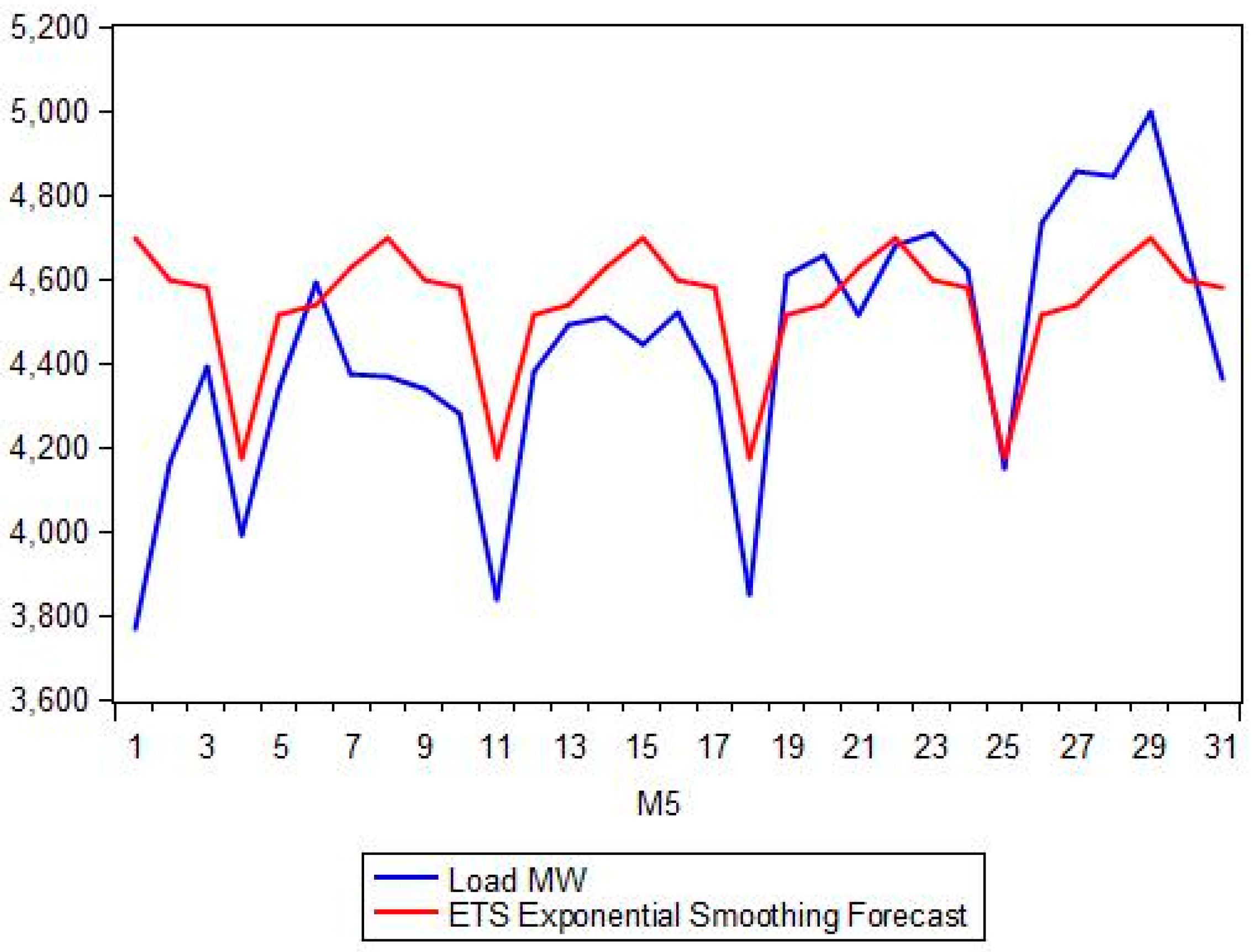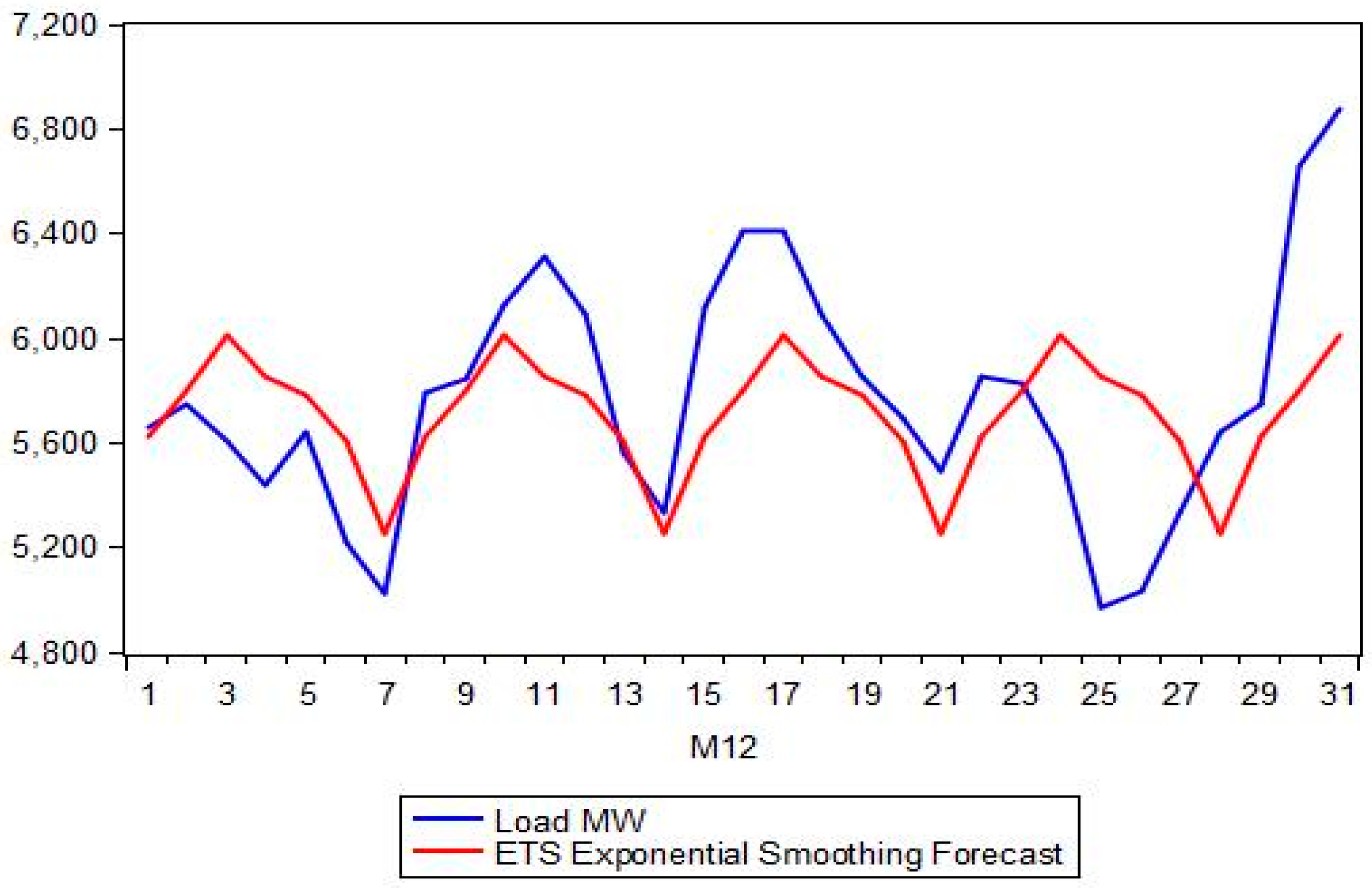 However, a subset of these methods is better known with other names. For instance, the well-known simple exponential smoothing (or SES) method corresponds to cell (N, N). Similarly, cell (A, N) is Holt’s linear method, and the damped trend method is given by cell (Ad, N). Also, the additive Holt-Winters’ method is given by cell (A, A) while and the multiplicative Holt-Winters’ method is given by cell (A, M). As it is described in Weron [114] and Taylor [115], exponential smoothing is the traditional model used in forecasting load data series. Due to its satisfactory results it has been adopted by lots of utilities. However, it is pointed out in the above paper that seasonal multiplicative smoothing, SMS, or a variant of it Holt-Winter’s SMS are very useful in capturing the seasonal (periodicity) behavior. Centra [116], has applied a Holt-Winter’s SMS model to forecast hourly electricity load.