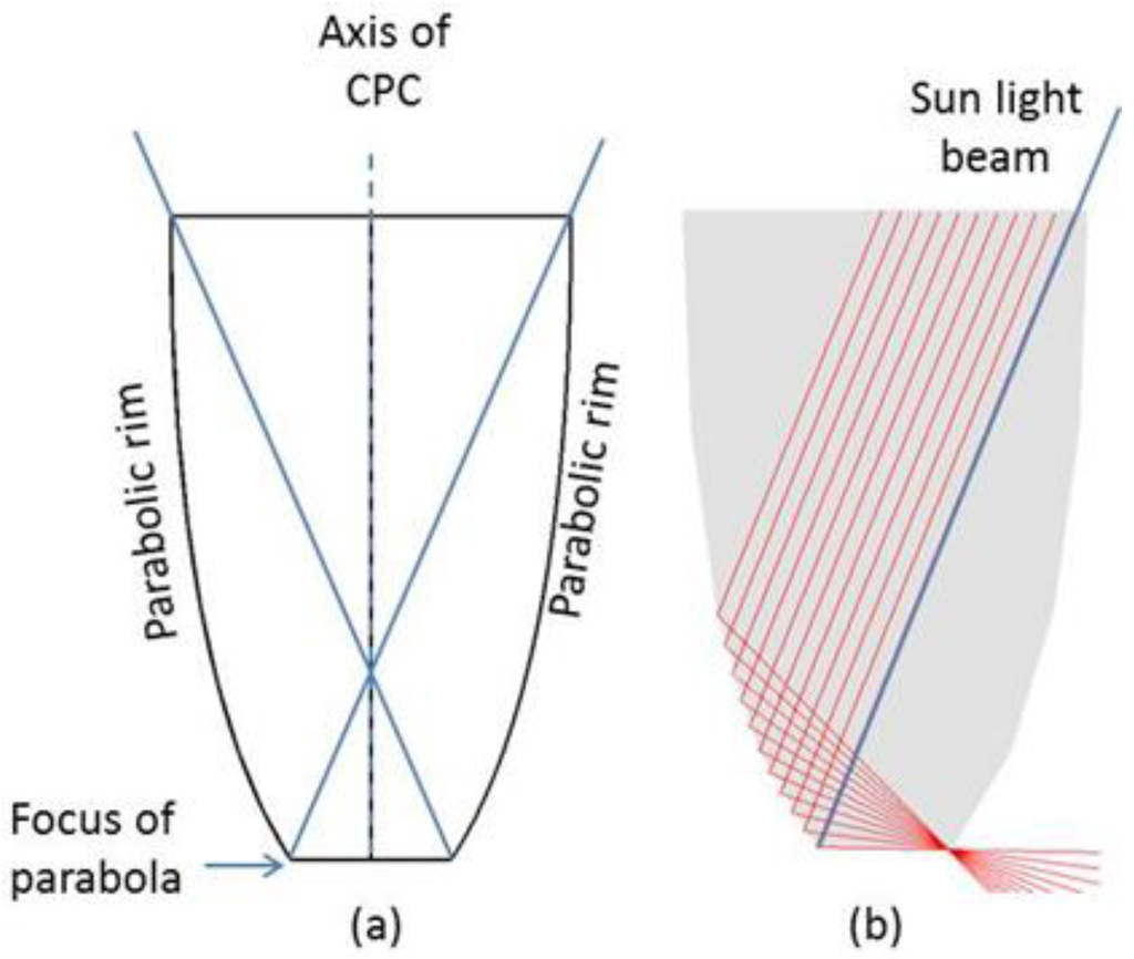 Figure 2. (a) A symmetrical CPC; and (b) ray tracing of the sunlight beam that is parallel to the axis of the parabolic rim.