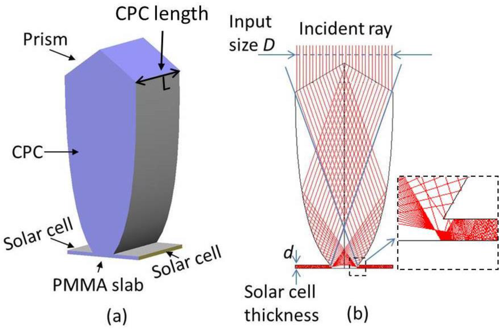 where nP is the refractive index of the prism. Solving Equation (1), we can find the structure of the prism. For this CPV system, the effective sunlight collecting area is calculated by the product of CPC length and input size D (the input size D is indicated in Figure 3b). The output apertures are two edges of the slab waveguide whose area is the multiplication of the length of the CPC by thickness d (parameter d is also indicated in Figure 3b). Therefore, the geometric concentration ratio of the system, CR, is the input size D divided by two times the waveguide thickness, as shown in Equation (2).