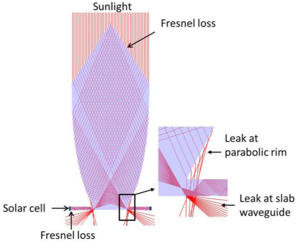 The loss mechanism is illustrated by ray tracing, as shown in Figure 6. The Fresnel reflection losses occur at the boundaries where the light passes from one region to another with different refractive indices. In this proposed system, the Fresnel losses occur at the surface of the prism. Other Fresnel loss at the conjunction between the solar cells and the edges of the waveguide can be reduced to below 0.1% by filling the gap with the index-matching gel, and then it can be ignored in comparison with other losses. The leak at the parabolic wall of the CPC and the bottom surface of the slab waveguide are also important and can significantly affect the final efficiency of the system. These kinds of losses are caused by some rays that cannot satisfy the total internal reflection (TIR) condition inside the P-CPC concentrator. These losses depend on the shape of the CPC and can be prevented when the solid CPC and slab waveguide have a mirror coating. However, the mirror coating usually has a lower reflectance than the total internal reflection, so the coating can have a positive or a negative effect on the optical performance of a P-CPC. Applying a mirror coating process also makes the system more costly.