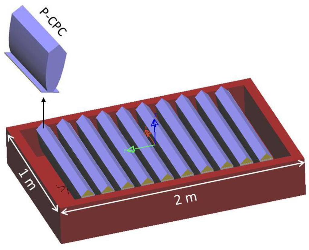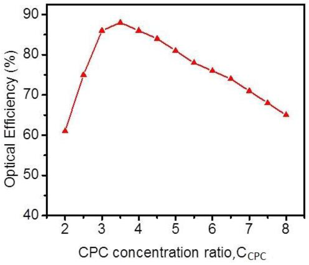 The efficiency of the system depends on the shape of the CPC and the system concentration ratio. These problems are discussed in detail in Section 3.1 and Section 3.2.