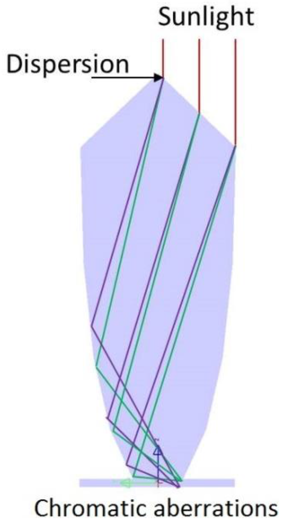 The prism attached at the top of the CPC to direct the sunlight beam is shown in Figure 3. However, the prism has an inherent disadvantage, which is the dispersion of the solar spectrum. For CPV systems, the dispersion of the solar spectrum range is very important because it leads to an essential decrease in the optical efficiency and concentration ratio of the systems. Figure 9 illustrates schematically how the sunlight beam passes through a P-CPC via a dispersion mechanism. The sunlight is dispersed at the focal point of the P-CPC due to the wavelength dependence of the refractive index of the prism material. The focused area also defines how big the sun’s image will be at the focal point, and it affects the coupling between the CPC and the slab waveguide. Larger slab waveguide thickness will capture more focused sunlight but will decrease the concentration ratio of the system.