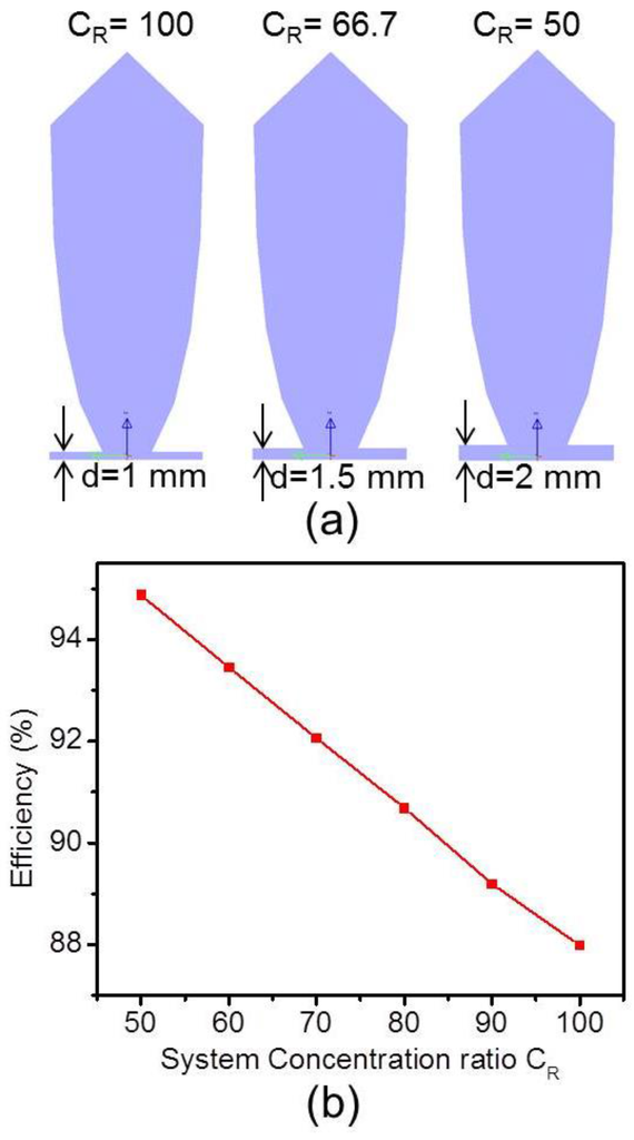 We used ray tracing in LightTools™ to analyze the dependence of efficiency on the thickness of the slab waveguide that is governed by the dispersion phenomenon. The sunlight source used in the analysis, generated by LightTools™, was in the range of 250–2500 nm [17]. The input aperture size is fixed at D = 200 mm, and the thickness of the slab waveguide d varies from 1 mm to 2 mm in the step of 0.2 mm. This means the concentration ratio CR decreases from 100 to 50 in the step of 10. Figure 10a illustrates the P-CPC structures with some different slab waveguide thicknesses, d = 1 mm, 1.5 mm, and 2 mm, respectively. Figure 10b shows the simulated optical efficiency at different system concentration ratios. It can be seen that because of dispersion, system efficiency η decreases almost linearly with the increase of CR. The lower concentration ratio can provide higher optical efficiency, but it also increases the area requirement of solar cells.