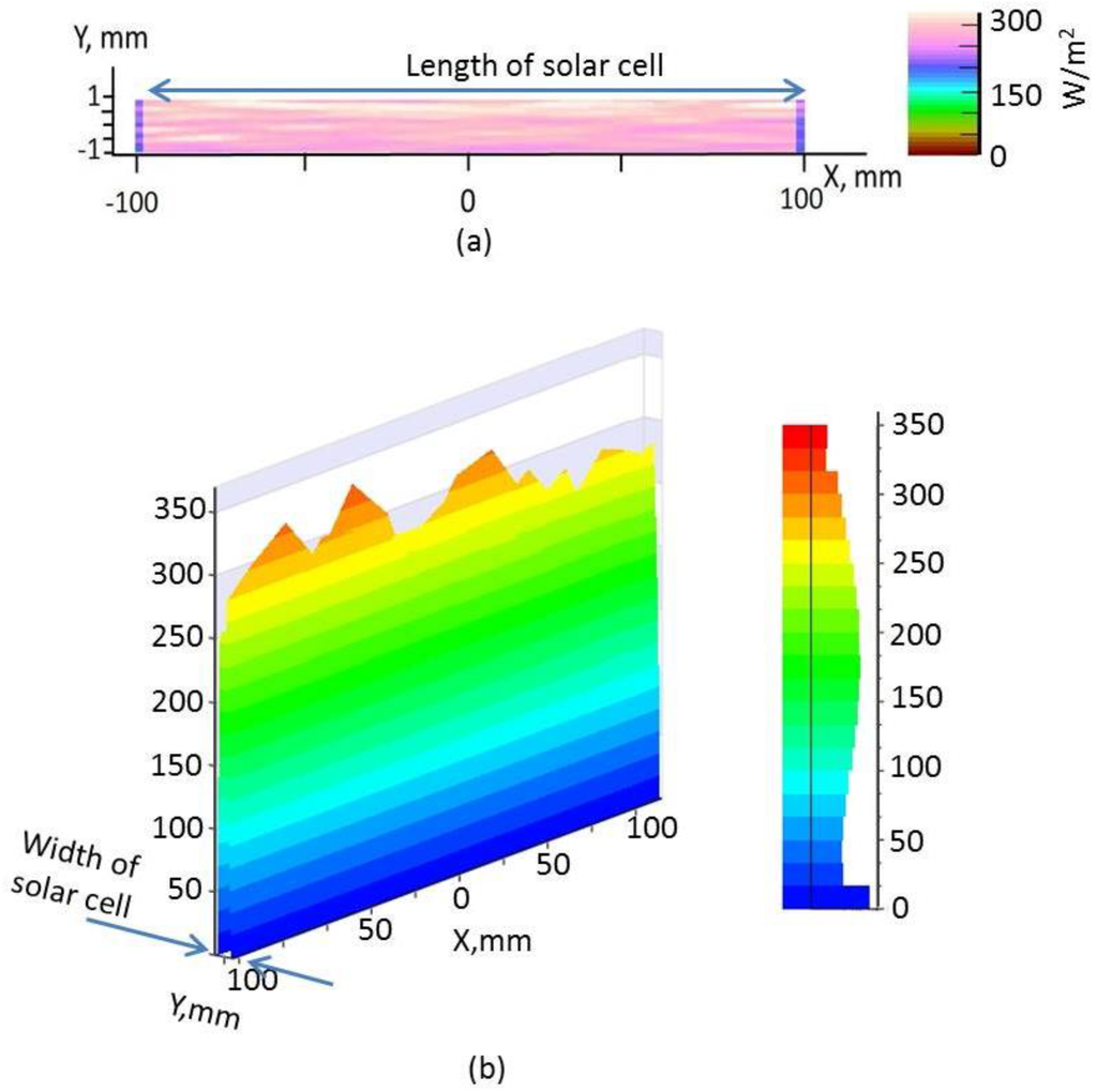 Besides concentration and the tolerance angle, an optical PV concentrator must achieve other goals [7]. One of these is irradiance uniformity on the cell. This is important not only because the cell efficiency depends on it but also to assure long-term cell and concentrator reliability. High flux contrast across the cell surface causes serious resistance losses, although this is less dramatic in multi-junction solar cells than in silicon cells. Another limitation specific to multi-junction cells, however, comes from tunnel diodes that need to be operating in their tunneling regime. This limits the irradiance at any point of the cell. Additionally, if different wavelengths have a different irradiance distribution (which has been referred to as the chromatic aberration of irradiance), the cell efficiency can be significantly affected due to a local current mismatch between the top and middle junctions. In this proposed solar concentrator, the slab waveguide works as a homogenizer for attaining good irradiance uniformity on the solar cells. With a slab waveguide homogenizer, the solar cell is glued to two edges; most of the light reaches the cell after bouncing off the waveguide surfaces by TIR [23,24,25]. The light distribution on the cell can be made uniform after sufficient length of slab waveguide. The uniformity of irradiation on the surface of the solar cell was evaluated and simulated using the same optical software (LightTools™). There are two solar cells which are attached at two exit ports of P-CPC, but they have the same uniformity because of symmetry property of P-CPC. We analyzed the uniformity at only one exit port. Figure 13a,b shows 2D and 3D irradiance distribution graph on the exit port. The maximum irradiance was 330 W/m2, the minimum irradiation was 285 W/m2, and the average irradiance was 299 W/m2. A uniformity Equation (4) [26] was adopted to calculate the uniformity of P-CPC concentrator, which reached 92.5%. It is clear that the proposed P-CPC can provide excellent irradiance uniformity on the cell.