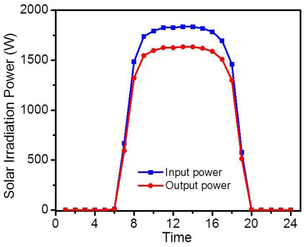 To evaluate the performance of the large scale CPV system, the irradiation from the sunlight was calculated at different times of day by LightTools™. The simulation considers the direct normal irradiance solar spectrum, generated by LightTools™, as the incident irradiance input parameter. Here, let us look at the solar irradiation for a summer day as an example. The highest solar elevation (zenith) angle at the site is 76°, and it takes place at 12:30 p.m. [27]. To achieve direct sunlight, we assume that the CPV system is mounted with a sun tracking device to rotate concentrator module toward the sun all time of the day. The area of the sunlight collector is 2 m2 as shown in Figure 14. Figure 15 shows the power of sunlight at the collecting surface of CPV system and output power at different times. The total output energy per day can be calculated by integration of output power over time. Based on Figure 15, the total solar energy along a day at the output is 18 KWh. Using multi-junction solar cells made of III–V compound semiconductors which have efficiencies of more than 40%, the system can generate about 7.2 KWh of electricity per day.