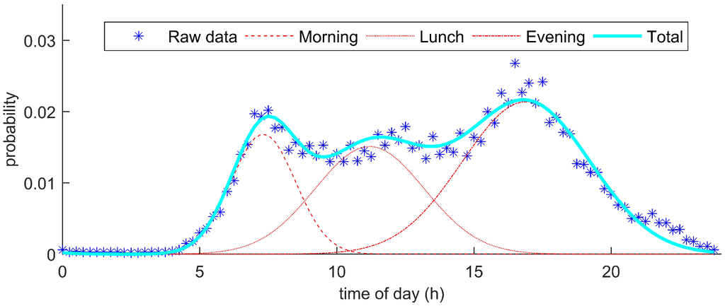 From publicly-available car mobility data [33,34] an empirical model was developed to capture the underlying driving behaviour. The raw data, , represents the probabilities of starting a trip during a 15-min period of a weekday. Three continuous normal distribution functions, each defined as: