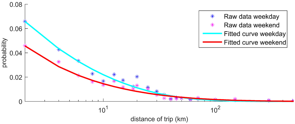Performing the curve fitting using the GRG optimisation algorithm, a weekday trip distance distribution, , and a weekend trip distribution, , could be estimated. The computed function parameters for these two estimated distribution functions are tabulated in Table 2. Their resulting probability distributions are plotted for comparison against the real data, and , in Figure 2.