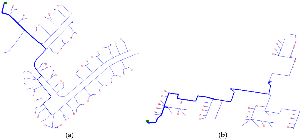 Sample Open Distribution System Simulator (OpenDSS) power flow plots of the used power networks. Consumers are indicated as red crosses and 11/0.416-kV substations are marked with a green square. (a) IEEE Power and Energy Society (PES) EU Low Voltage Test Feeder plot; (b) Scottish and Southern Energy Power Distribution (SSE-PD) Common Information Model (CIM) (UK) feeder plot.