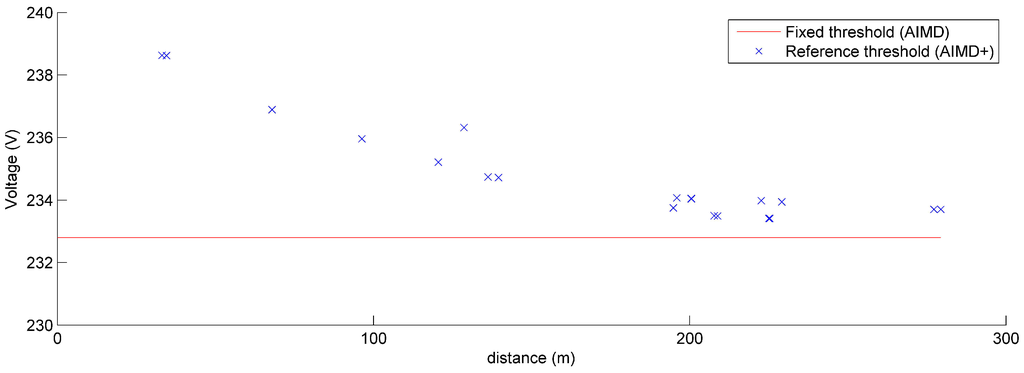 In the AIMD+, consumers located at the head of the feeder are allocated a higher voltage threshold, while those towards the end of the feeder have similar voltage thresholds to that of the fixed threshold. This replicates the expected voltage drop along the length of the feeder, hence resulting in a more equal utilisation of battery storage units that are located at those distances. The voltage threshold is set in such a way as to limit the maximum voltage drop to 3% at the end of the feeder.
