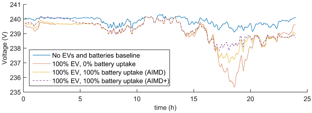 In this last figure, it can be seen how the sole impact of BESS uptake reflects in a continuing improvement of voltage levels. In fact, both compared algorithms improved the bus voltage, which coincides with the findings in the case studies. On average, this is the case for all BESS uptakes, as . Nonetheless, it should be noted that the AIMD+ algorithm had reduced the frequency of severe voltage deviations in comparison to the AIMD algorithm and is more effective during scenarios with lower BESS uptake.