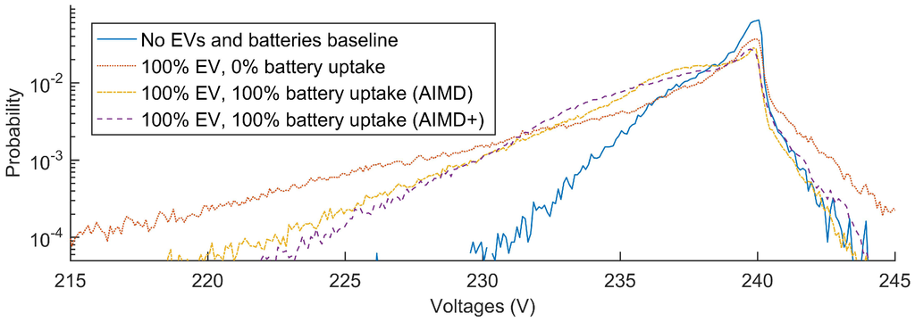 In this histogram, the voltage probability distributions for all four cases were normalised and plotted against each other. Here, the previously seen drop in voltages by introducing EVs is recorded as a shift in the voltage distribution. This voltage drop is mitigated by the introduction of the storage solutions, since the probability distribution is shifted towards higher voltage bands. For the IEEE EU LV Test feeder, the AIMD+-controlled batteries outperform the AIMD devices as the resulting is greater than .