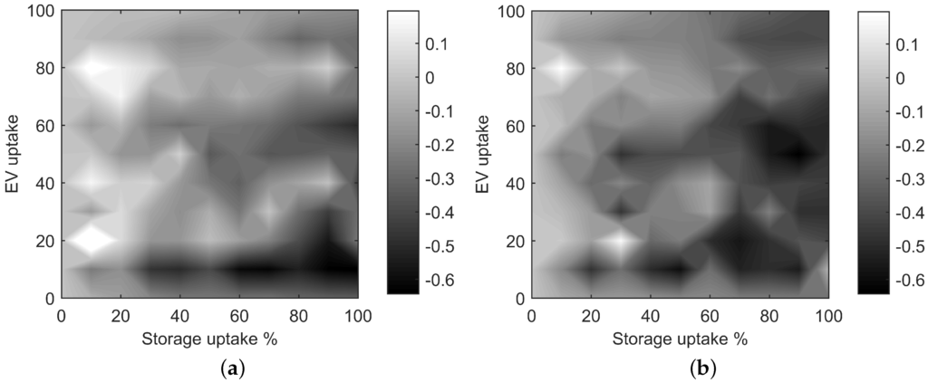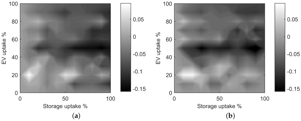 Here, the AIMD+ controlled storage devices yielded a noticeable reduction in line overloads. This improvement is apparent through the compressed width of the probability distribution and the negative value. In contrast, the AIMD controlled storage devices do not fully utilise the line capacity as effectively, which leads to a positive value of . To evaluate the line utilisation improvement across all simulations, the full range of EV and storage uptake was evaluated. The resulting plots are shown in Figure 11.