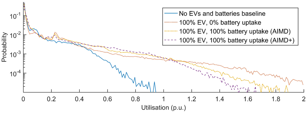 Similar to the voltage improvement analysis, a frequency distribution of the line utilisation was generated. Figure 10 shows a probability distribution of the per unit (1 p.u. represents a 100% line usage, i.e., a line current of the same value as the line’s nominal current rating) current in all lines, for each of the four scenarios. The corresponding and values for the AIMD and AIMD+ storage deployment have also been included in the figure’s caption. In this figure, the observed high probability of line over-utilisation confirms that the used test network is of insufficient capacity to cater for the chosen EV uptake.
