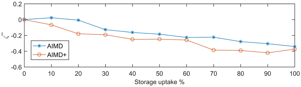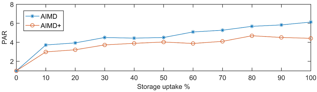 Averaging the PARs for all batteries’ SOC profiles over all EV uptake percentages yields a clear performance difference between AIMD and AIMD+. These resulting PARs, i.e., the and values for their corresponding storage uptake percentages, are presented in Figure 16.