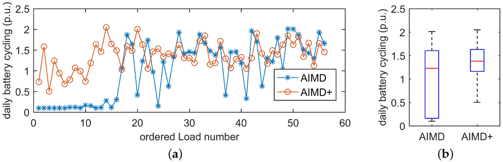 Each load’s battery cycling compared for (a) 60% EV and 100% AIMD and AIMD+ uptake and (b) in a statistical context. Here, and . (a) Battery cycling for each load; (b) statistic.