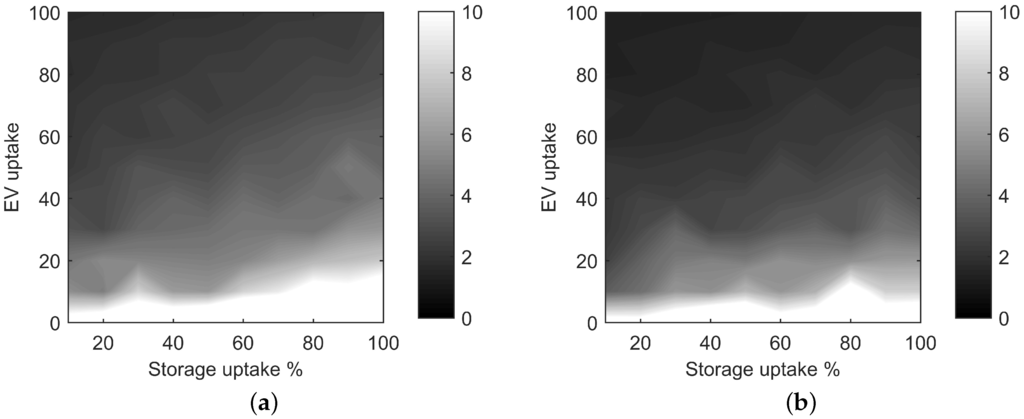These two plots show the under-usage of AIMD controlled batteries, as well as the variance in battery usage under AIMD and AIMD+ control. In fact, under AIMD control, 20 out of 55 batteries experienced a cycling of less than 10% per day, whereas the remaining devices were utilised fully. This discrepancy causes the value to be noticeably larger than . A more detailed comparison is given when plotting the Peak-to-Average Ratios (PAR) of the batteries’ daily cycling over the full range of EV and storage uptake scenarios; these plots are shown in Figure 15. Section 5.2.3 gives the detail on the PAR, .