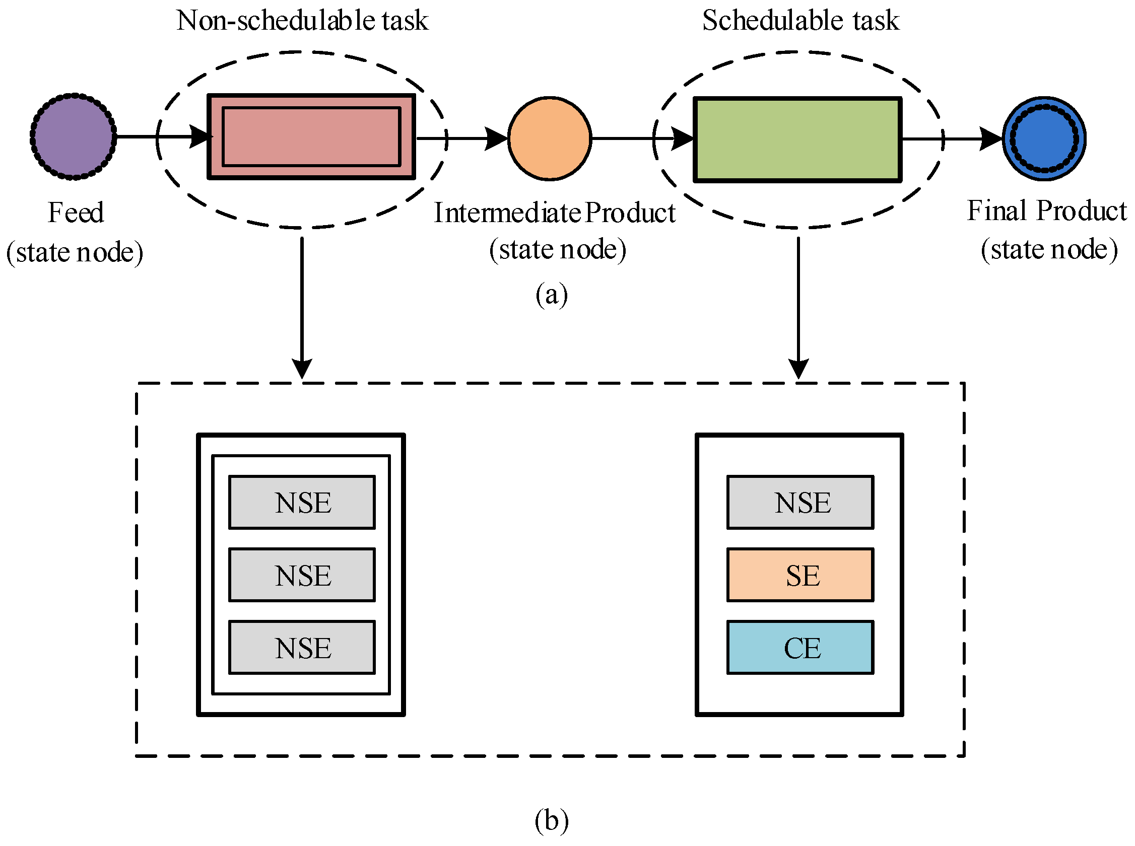 Based on process manufacturing, Kondili et al. [26] proposed a general STN model which consisted of state nodes and task nodes. Georgiadis et al. [15] extended this model to discrete manufacturing, which differs from process manufacturing. In order to implement energy management on the consumer side, Ding et al. [27] expanded this general STN model to propose a DR scheme for industrial facilities in SG, while in further research, Ding et al. [28] proposed a specific DR algorithm and evaluated its performance with a typical continuous industrial process as a scenario. As shown in Figure 1a, the DR scheme has state nodes including feed, intermediate product and final product, and task nodes which can be subdivided into non-schedulable tasks (NSTs), for which the electricity demand cannot be scheduled and must be satisfied immediately (for technical or economic reasons); and schedulable tasks (STs), for which the electricity demand can be scheduled among pre-specified multiple operating points. Figure 1b shows the simple internal structure of each task with the corresponding industrial equipment. In this DR scheme, the industrial equipment is classified into three types: non-shiftable equipment (NSE), which should have a sufficient supply of electricity whenever it is required; shiftable equipment (SE), which can be switched on or off to balance the electricity supply; and controllable equipment (CE), which has multiple operating states with different electricity demands. Based on the properties of each type of equipment, NSTs will be only composed of NSEs, and STs can consist of one or more NES, SE, or CE pieces.