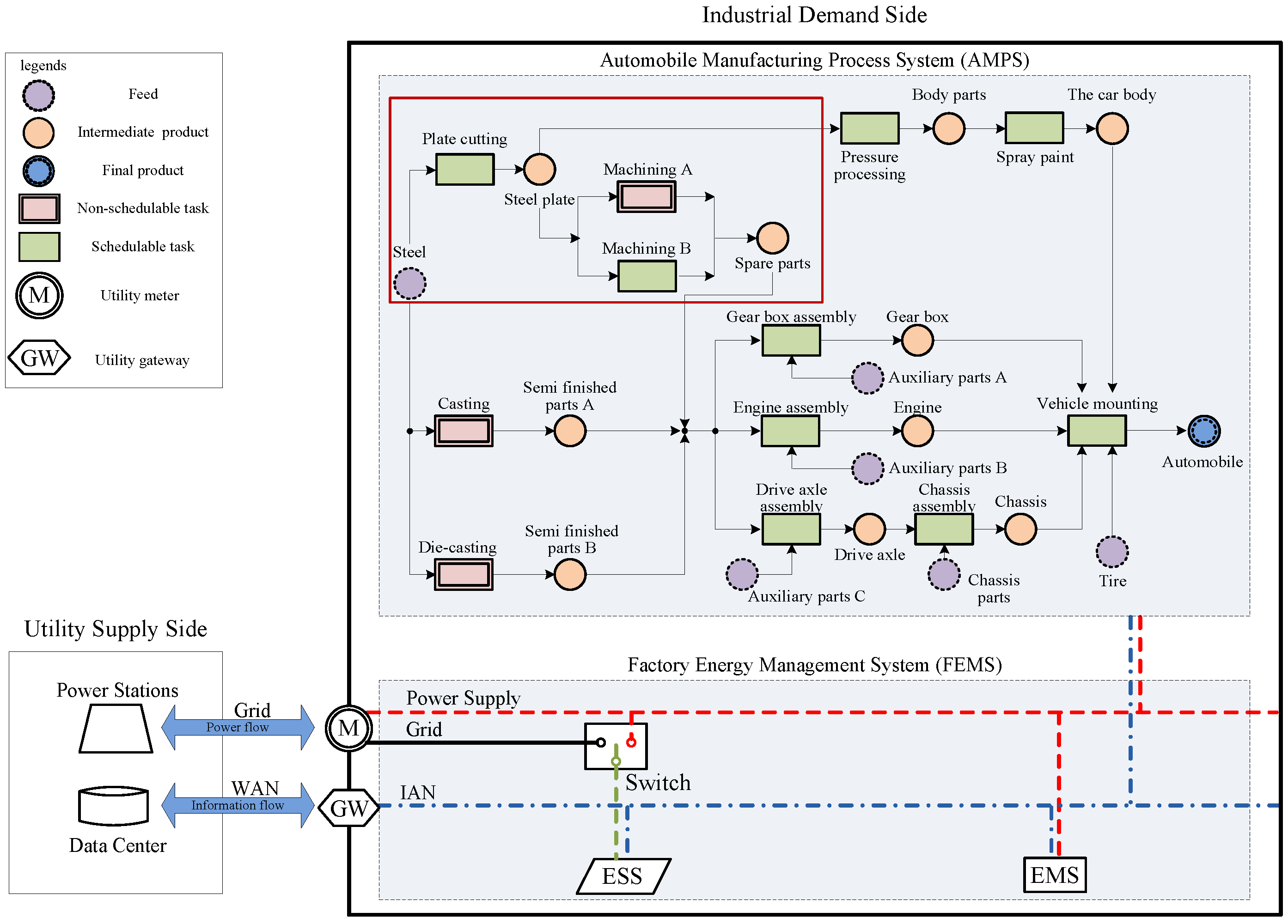 The utility supply side includes power stations to provide electrical energy for industrial manufacturing through the electrical grid, and a utility data center to communicate with the industrial demand side via the WAN. The industrial demand side is also composed of two subsystems, the automobile manufacturing process system (AMPS) which includes the whole automobile production process represented by the STN model, and the FEMS which includes an energy management system (EMS), ESS, the power source switch, the power supply network, and the IAN.