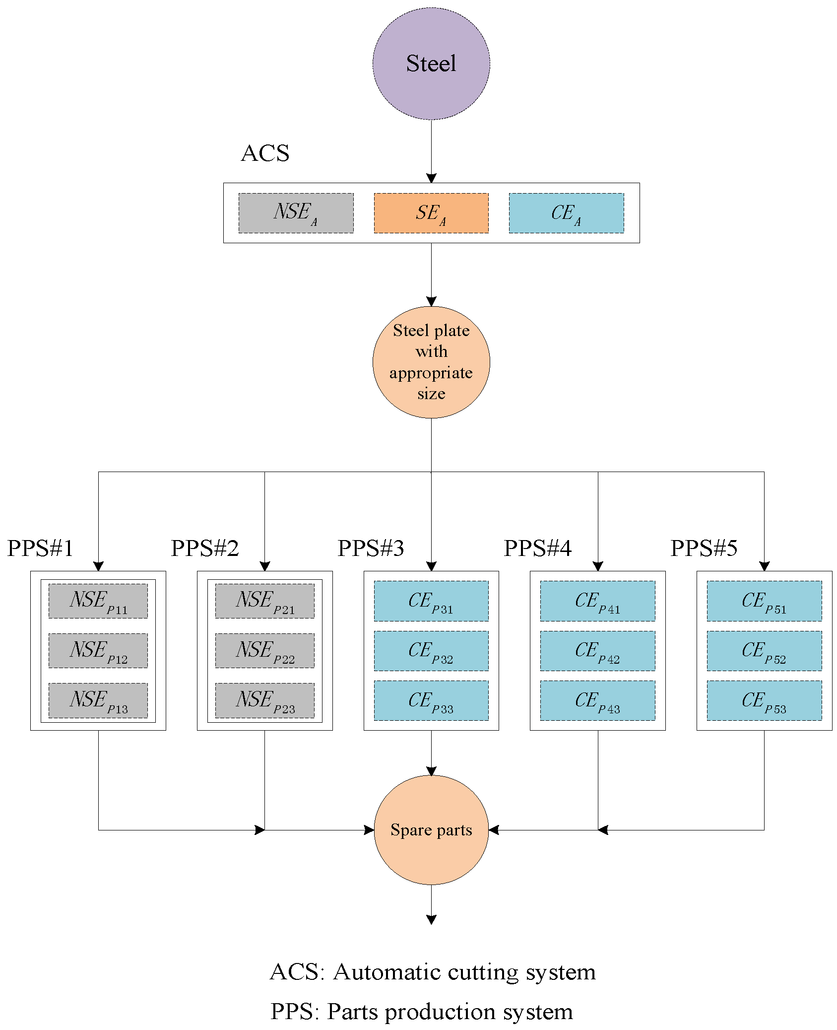 Figure 3 shows the DR representation for the stamping process, which incorporates production processes from steel (raw material) to spare parts (intermediate products of the whole production line). The stamping process can be regarded as two subsystems: the automatic cutting system (ACS) corresponding to plate cutting task in Figure 2, and the parts production system (PPS) corresponding to machining A task or machining B task in Figure 2.