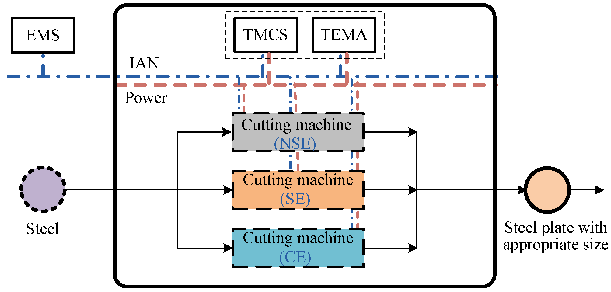In the ACS task, these cutting machines cut the steel into steel plate with several appropriate sizes, which will be used as materials for other tasks. The ACS is assumed to have three kinds of cutting machines corresponding to NSE, SE and CE, respectively. The first type (which may be a general-purpose machine tool) regarded as an NSE, has only one operating state since it has a long start-up time and cannot be stopped arbitrarily once launched. The second type (which may be a high-speed precision numerical control machine tool with a fixed strokes per minute) regarded as an SE, has two work states (on or off) since it can be started or stopped immediately. The third type (which may be a high-speed precision numerical control machine tool with a variable strokes per minute) regarded as a CE, which has multiple operating states with different consumption rates of materials, generation rates of products, and corresponding electricity demands, since it can be changed from one working state to another in a short time. By managing the operating states of SE and CE, the TEMA defines multiple operating points for the ACS task and reports the current state of each operating point to the EMS through the IAN. The operating point with a low production rate consumes electrical energy at a low rate, while the operating point with a high production rate consumes electrical energy at a high rate. Based on the dynamic day-ahead electricity prices from the utility supply side, the EMS makes optimal decisions on operating points for each task during each time interval, and then transmits this information to the TEMA. According to the information from the TEMA, the TMCS controls each piece of equipment to work on the corresponding operating state. The TEMA then transmits consumption data collected from each piece of equipment to the EMS through the IAN. As shown in Figure 5, the internal structure of each PPS task has a local TMCS, a local TEMA and three pieces of industrial equipment matched with corresponding three steps in the PPS task.