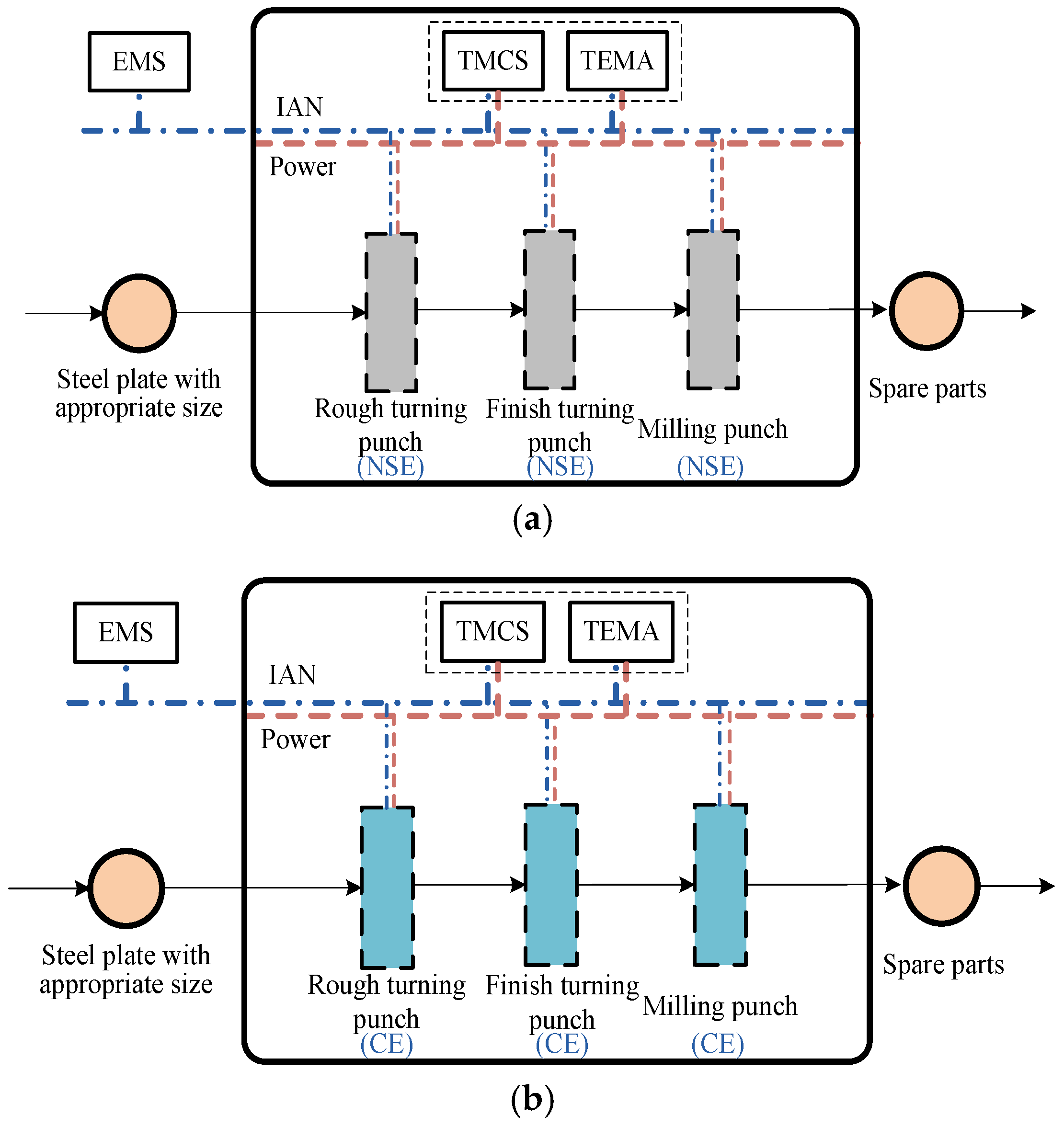 The ACS is an ST and consists of three pieces of industrial equipment, which are classified as NSE, SE and CE, respectively. PPS#1 and 2 (both of which correspond to the machining A task) are NSTs and consist of three pieces of industrial equipment regarded as NSEs. PPS#3, 4, and 5 (each of which corresponds to the machining B task) are STs and consist of three pieces of industrial equipment regarded as CEs.