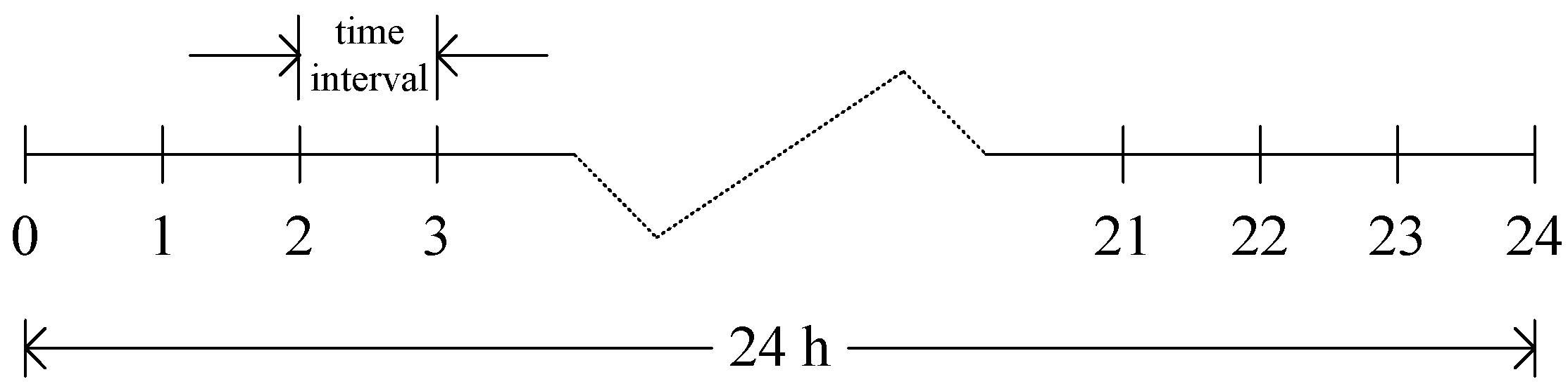 This section consists of two subparts to introduce the DR scheme proposed in [27]. The first one discusses the pure DR scheme (excluding ESS) for an FEMS in SG. The second includes an ESS, which can be integrated into the DR scheme. The DR scheme is operated on the basis of the day-ahead hourly electricity prices, and the time horizon of 24 h is discretized into 24 time intervals with each interval having the same time duration of 1 h, as shown in Figure 6.
