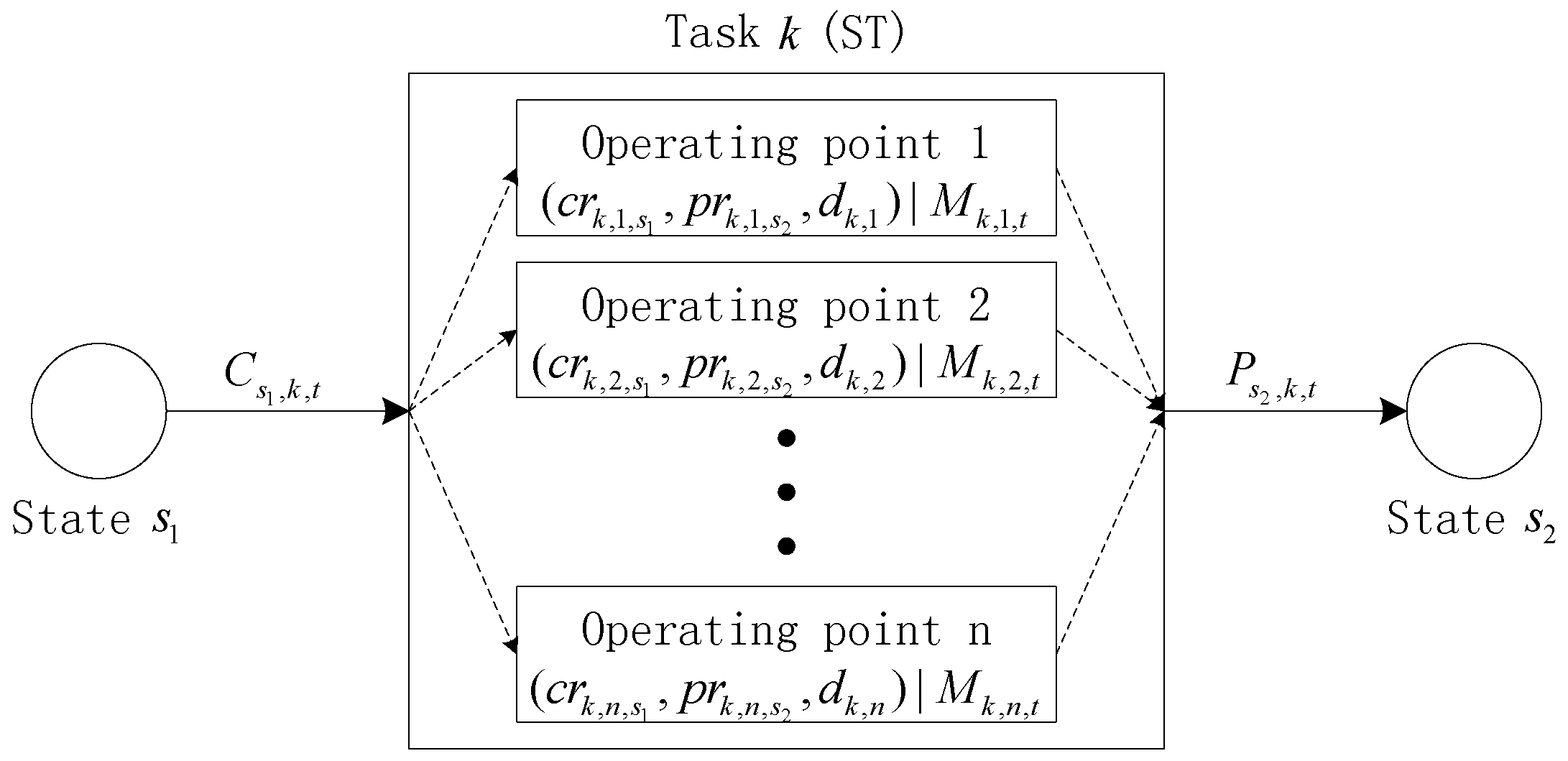 Assuming that task k is a ST as shown in Figure 7, it consumes state s1 to produce state s2 by choosing one of n operating points during each time interval. Each operating point is composed of two sets of parameters. The first is a pair of parameters including the consumption rate of raw material crk,n,s1, generation rate of product prk,n,s2 and corresponding electricity demand of that task dk,n. The second is a binary variable Mk,n,t to indicate if task k operates at operating point n during time interval (t, t+1) or does not (if the task operates, Mk,n,t = 1, otherwise Mk,n,t = 0). Among all operating points (from operating point 1 to operating point n), Equation (3) restricts that a ST k must operate at only one operating point within the same time interval.