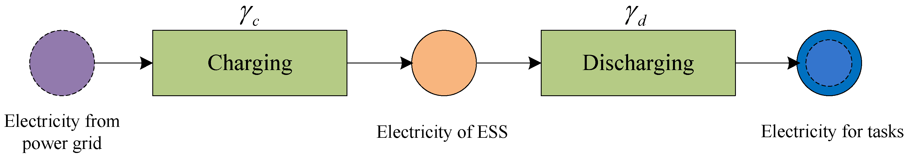 With the interaction of ESS, the objective function is modified as Equation (9). is the total electricity demand of industrial manufacturing from the electrical grid within the interaction of the ESS in time interval (t, t + 1), and it is equal to the energy consumption of all tasks Dt plus the charging energy of the ESS Ec,t, minus the discharging energy of the ESS Ed,t: