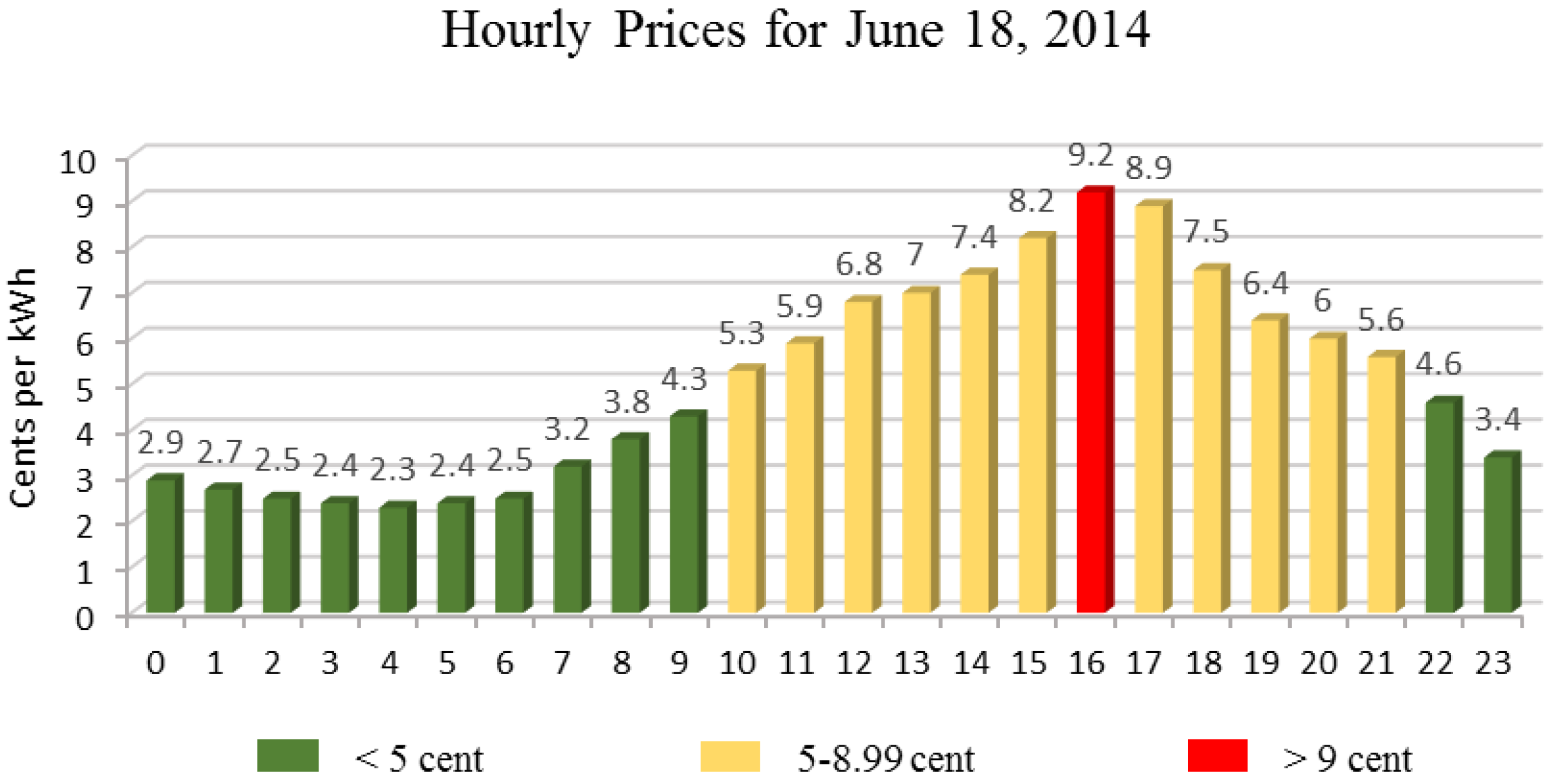 Day-ahead hourly electricity prices from Ameren Illinois for 18 June 2014. The prices can be classified into three types: low-price (green), high-price (yellow), and peak-price (red).