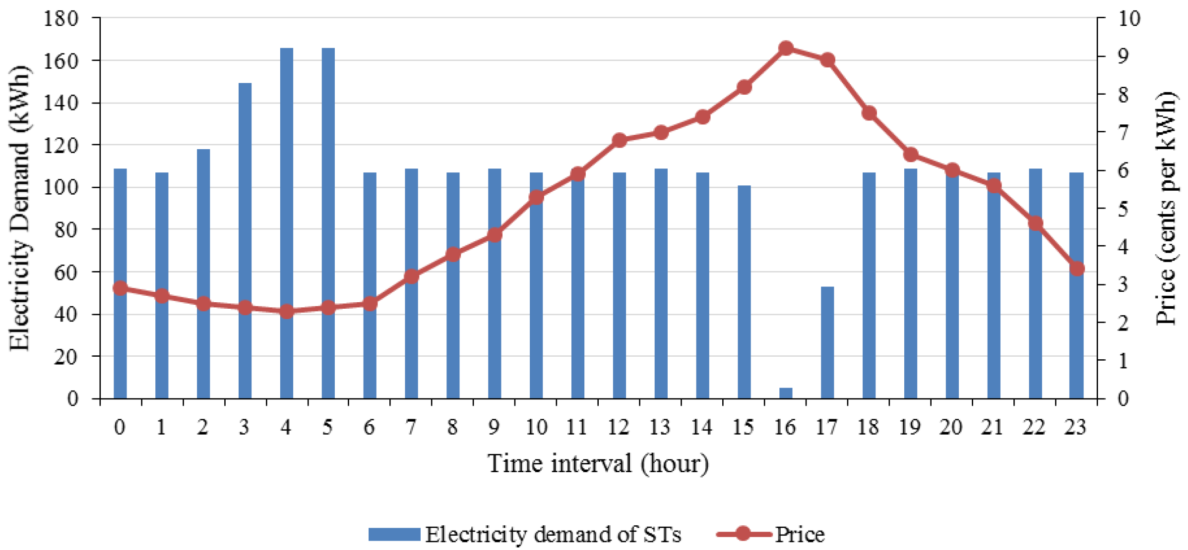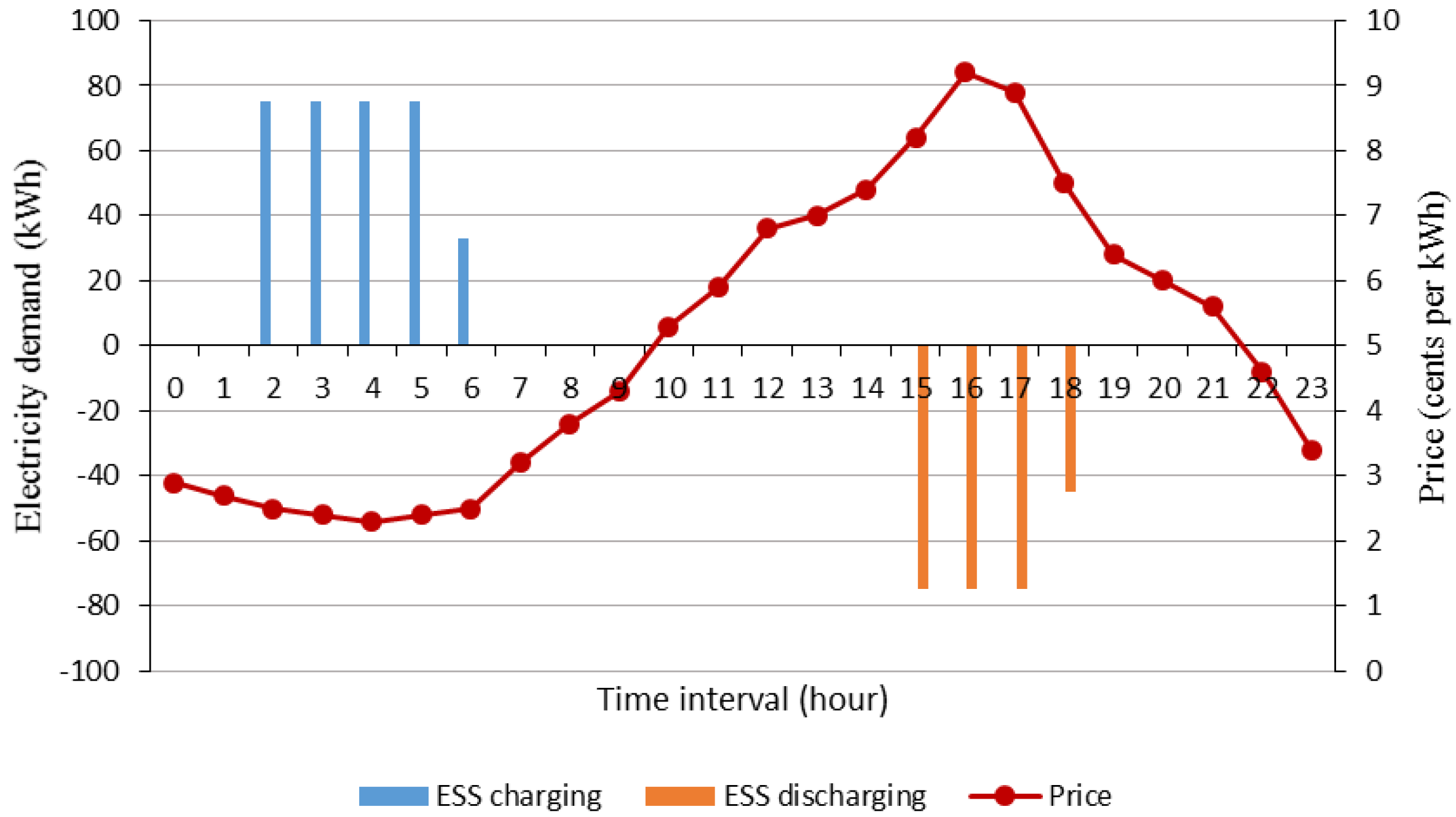 Table 5 lists the parameters related to ESS. The initial storage was 0 kWh and the storage capacity was assumed to be 300 kWh. The maximum charging/discharging rate was set to 75 kWh, and the charging/discharging efficiency coefficient was set to 0.9. The rate of electricity charged/discharged during a given time interval was assumed to be continuously controlled between zero and the maximum charge/discharge rate. Electricity prices were generated using price data obtained from Ameren Illinois Power Company (Belleville, MI, USA) [31] as day-ahead hourly electricity prices (Figure 9).