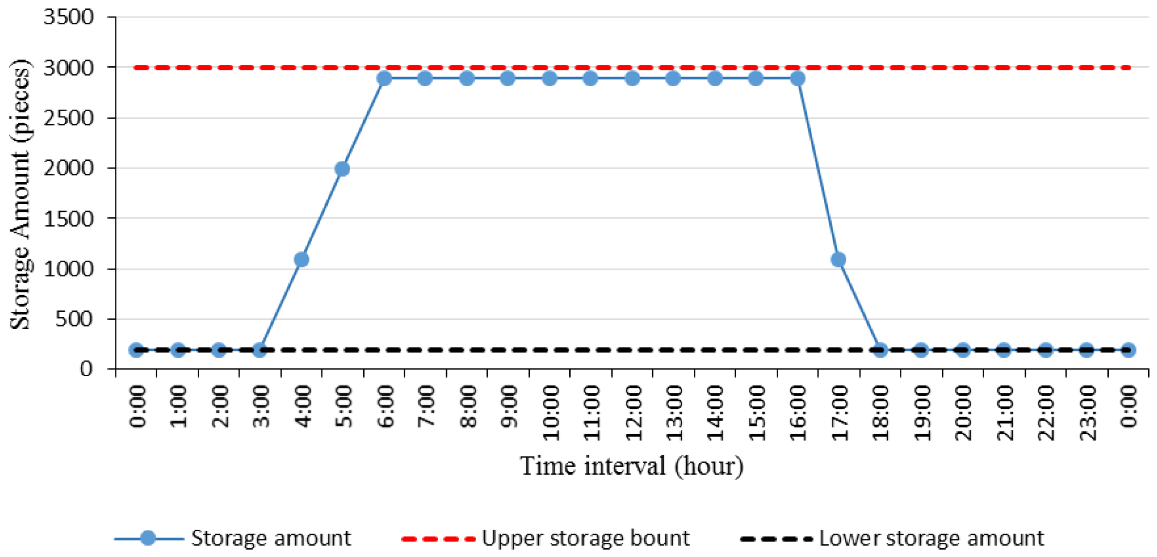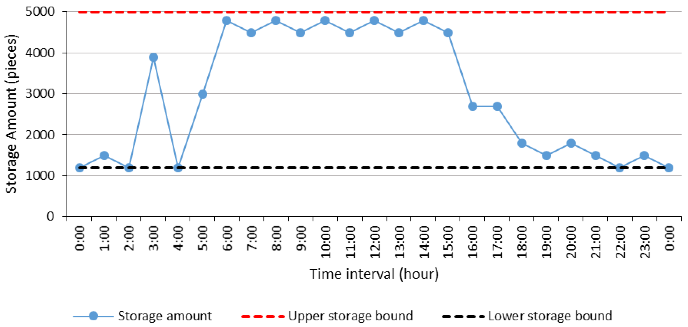 Table 4 lists the related parameters of steel plate and spare parts. The initial storage and storage capacity of steel plate were set to 1200 and 5000, respectively, while the initial storage and storage capacity of spare parts were respectively set to 200 and 3000. In industrial processes, maintaining some margin for reliable production is preferable. Therefore, we set the parameter SP_Init to 1200 and the parameter PP_Init to 200 (rather than 0). In the whole production process, the consumption of spare parts in every hour was 3000 pieces, and the storage capacity of the feed (the steel) was assumed to be infinite.
