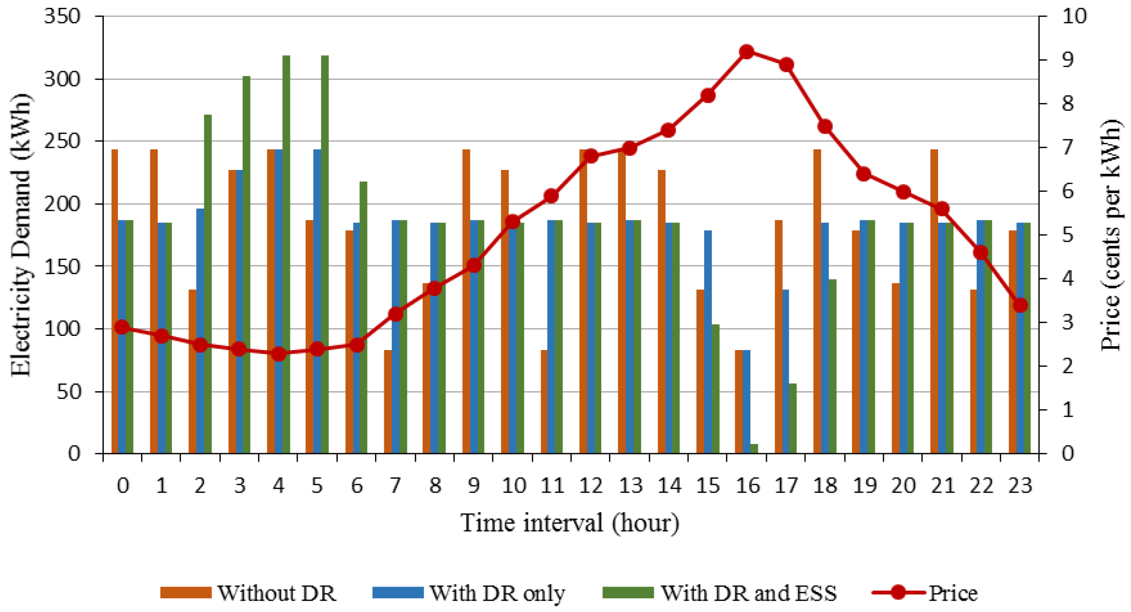 DR includes all potential modifications to the electricity consumption patterns of end-use customers that schedule the timing of energy usage, change the instantaneous demand during crucial periods, and change energy consumption patterns to respond to electricity prices [11]. Integration of DR into SGs can provide consumers with optimal energy allocation, minimize energy consumption costs, and curtail peak-hour usage, all of which help to avoid power quality degradation or blackout. Furthermore, it takes advantage of in-facility distributed energy resources (DERs), such as energy storage systems (ESSs), to play a further role in costs reduction and electrical reliability improvement.