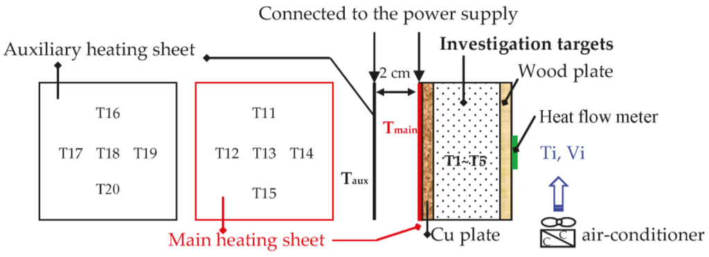 Figure 3 presents the temperature measuring points. Five type-K thermocouples were placed on the surface of the main heating sheet and auxiliary heating sheet to determine Tmain and Taux, respectively. Thermocouples were placed on the surface of the copper plate and wood plate to monitor the hot and cold wall temperatures, respectively. Heat flow inward to the interior was measured directly by heat flow meters. The device and data acquisition system included data acquisition units with 1 Hz data sampling rate (MX-100, YOKOGAWA, Tokyo, Japan), a PC, heat flow meters (MF-180, EKO Instruments, Tokyo, Japan), and AC/DC power supply units (GW Instek APS-1102, Good Will Instrument, New Taipei City, Taiwan).