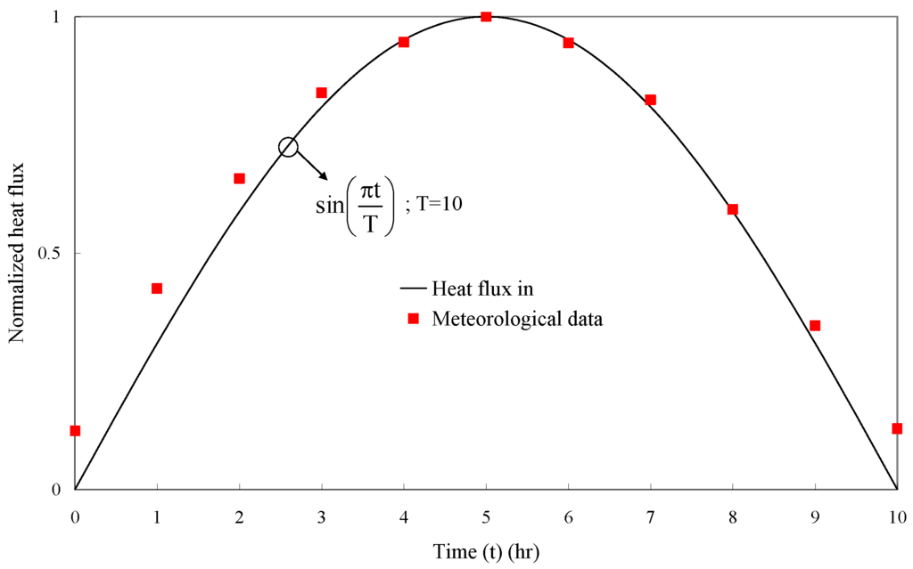 To establish solar radiation conditions that were as realistic as possible, the time-variant heat flux at the hot wall was obtained from meteorological data measured from June to August 2011 (summer season in Taiwan) for the average hourly amount of sunlight and was considered to be a sine function of time, as shown in Equation (1) and Figure 4. Figure 4 illustrates the heat flux input and measured meteorological data, both normalized by the respective peak values. The level of solar radiation immediately before sunrise and immediately after sunset is zero. Immediately after sunrise, the radiation begins to increase until a maximum is reached, after which the radiation decreases until sunset.