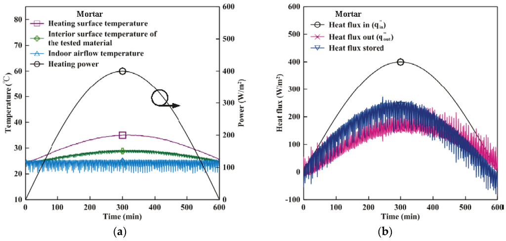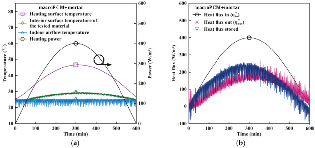 Next, we added macroPCM (67.75 g) into the cement mortar. The results obtained from the macroPCM + mortar module (Figure 6) show similar variation patterns compared to those observed in the cement mortar module (Figure 5). As shown in Figure 6b, the highest of the macroPCM + mortar module is approximately 181.2 W/m2, which occurs at 330 min (time lag = 30 min). Compared with the mortar module, the macroPCM + mortar module has a larger time lag due to the energy storage of the incorporated PCM and a slightly increased peak heat flux (decrement factor = 0.55).