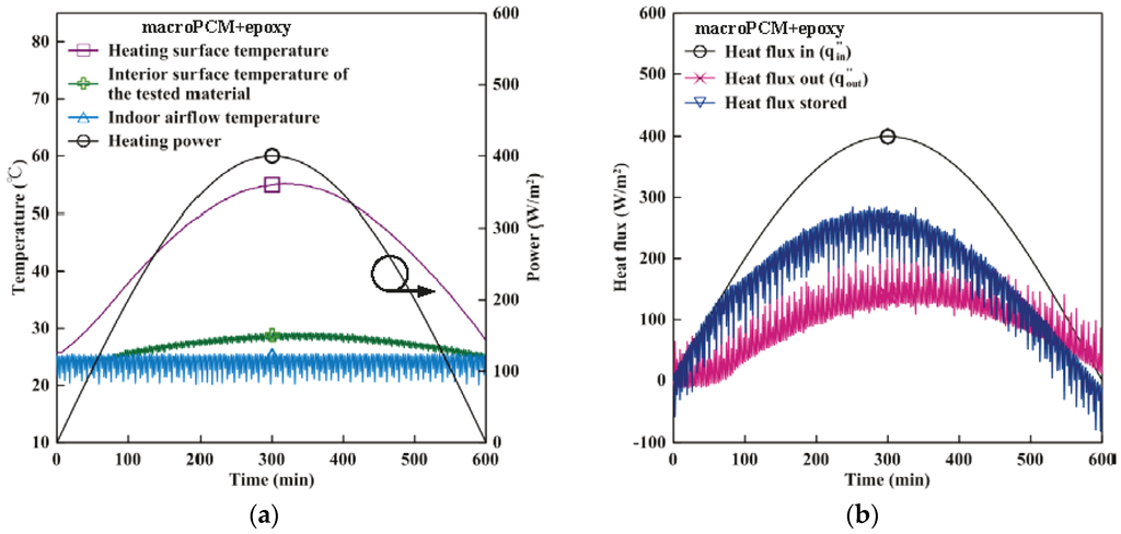 Heat transfer behavior of macroPCM + epoxy (Gs,o = 400 W/m2): (a) Temperature changes with time; (b) Heat flux changes with time.