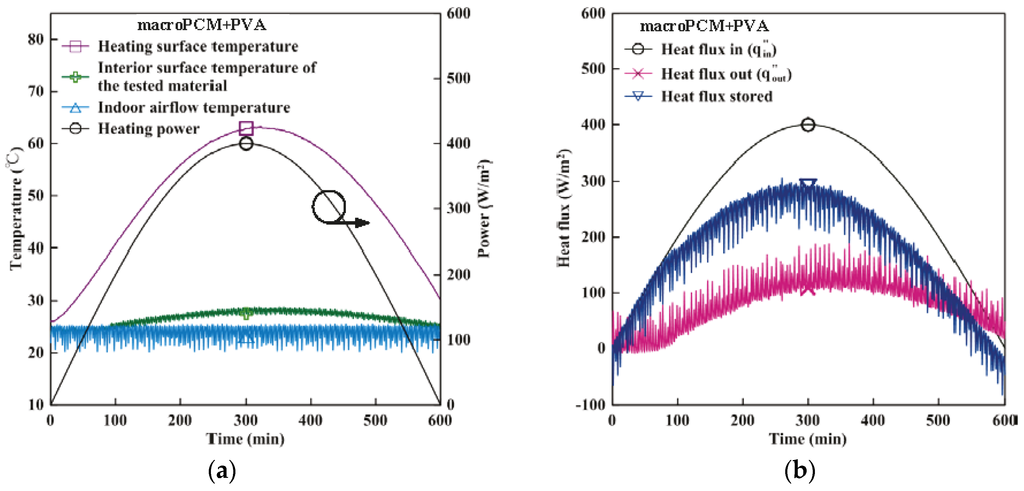Compared to the above two modules, the macroPCM + epoxy and macroPCM + PVA modules present different results, mainly because of the lower heat conductivities of epoxy (~0.3 W/m K) and PVA (~0.16 W/m·K) and latent heat of macroPCM. Figure 7b shows that when macroPCM (89.6 g, 56.6% mass fraction) was added into the epoxy, the highest of the macroPCM + epoxy module is approximately 145.2 W/m2 and occurs at 335 min (time lag = 35 min). Compared with the above two modules, the macroPCM + epoxy module has a larger time lag but a significantly reduced heat flux (decrement factor = 0.64). Next, we added macroPCM (95.9 g, 55% mass fraction) into PVA. In Figure 8b, it can be seen that the macroPCM + PVA module has its highest of 126.6 W/m2 at 340 min (time lag = 40 min). Compared with the above three modules, the macroPCM + PVA module has a relatively large time lag but a significantly reduced heat flux (decrement factor = 0.68).