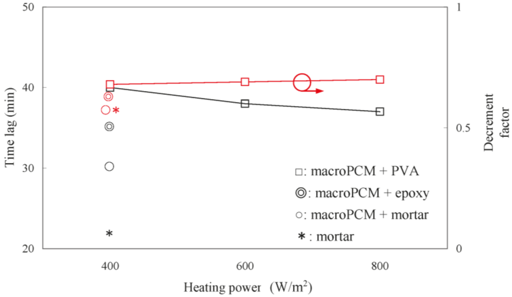 As shown in Figure 9, when the heating power is gradually increased from 400 to 800 W/m2, the time lag from macroPCM + PVA is somewhat reduced but the decrement factor remains at 0.7, indicating its excellent heat flux insulation capability. In the following section, we investigated the transient thermal performance of macroPCM + PVA in relation to different levels of solar heat gain.