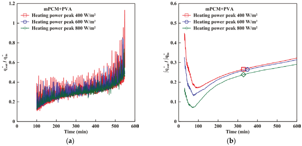 Histories of (a) instantaneous and (b) time-averaged, fractional heat penetration onto the interior side of the macroPCM + PVA wall tile with various heating powers.